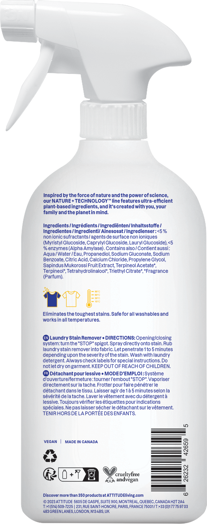 Der Fleckenentferner von ATTITUDE bekämpft hartnäckige Flecken auf der Wäsche natürlich und effizient auf pflanzlicher Basis.