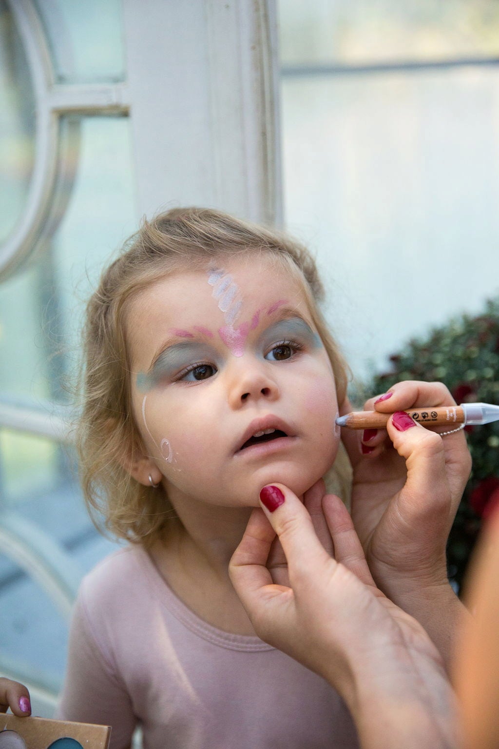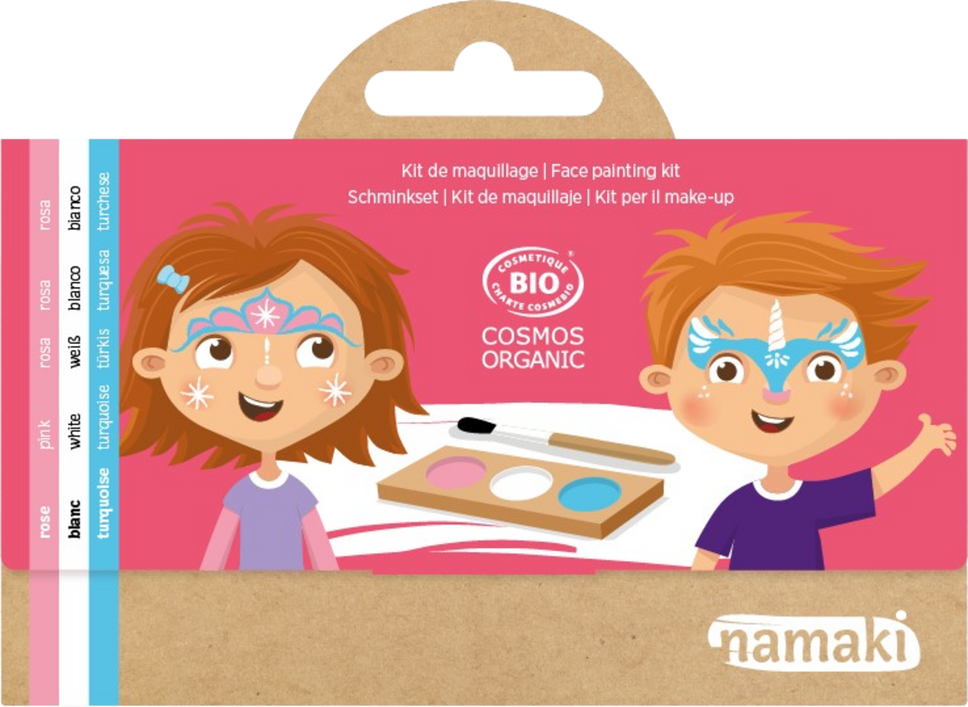 Verwandle dich in eine Prinzessin oder ein Einhorn! Die Farben Weiß, Rosa sowie Türkis und der Pinsel helfen dir dabei. Ihre Rezepturen sind hypoallergen und völlig unbedenklich für empfindliche Kinderhaut. Überdies lassen sich die Farben einfach abwaschen.