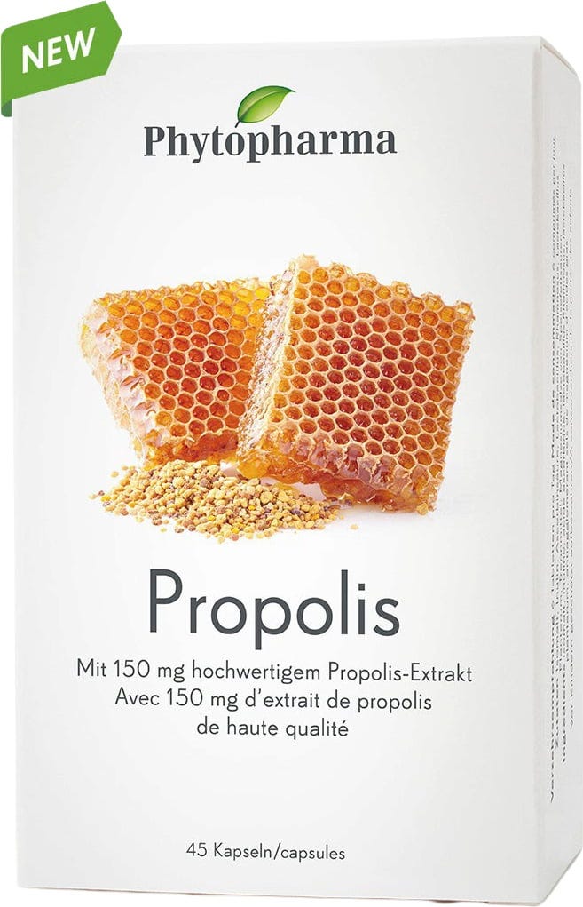 Die Propolis Kapseln von Phytopharma enthalten hochwertiges Propolis-Extrakt und Vitamin C. Sie sind gluten- und laktosefrei.