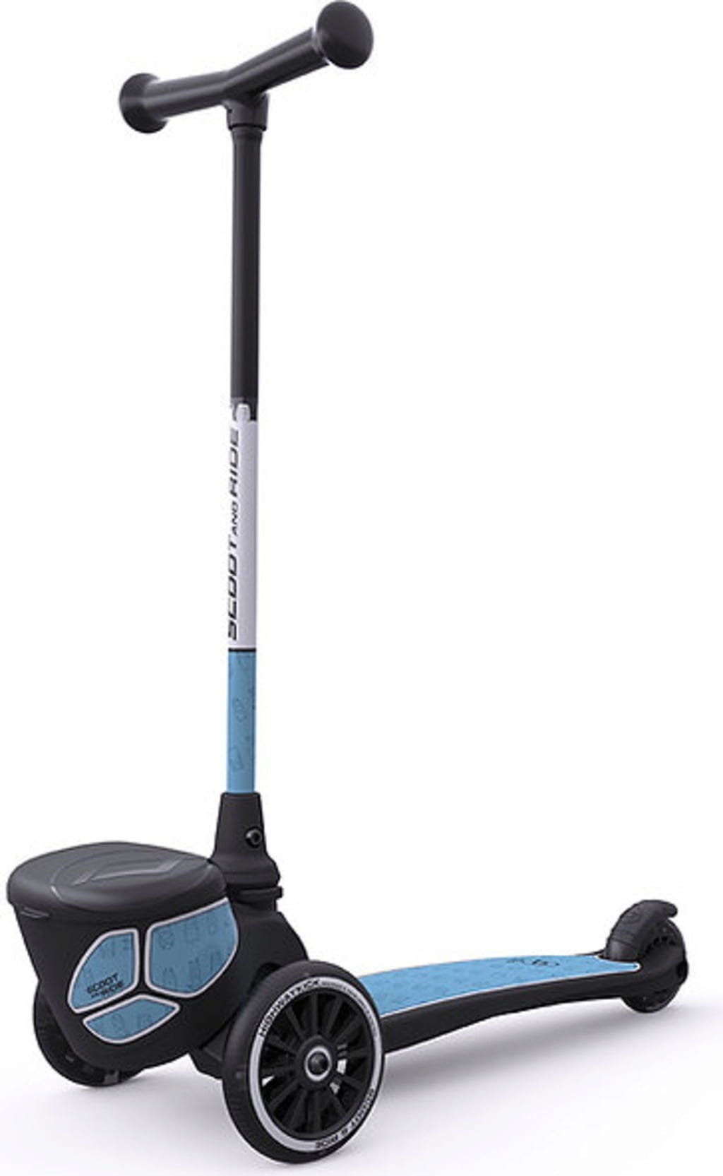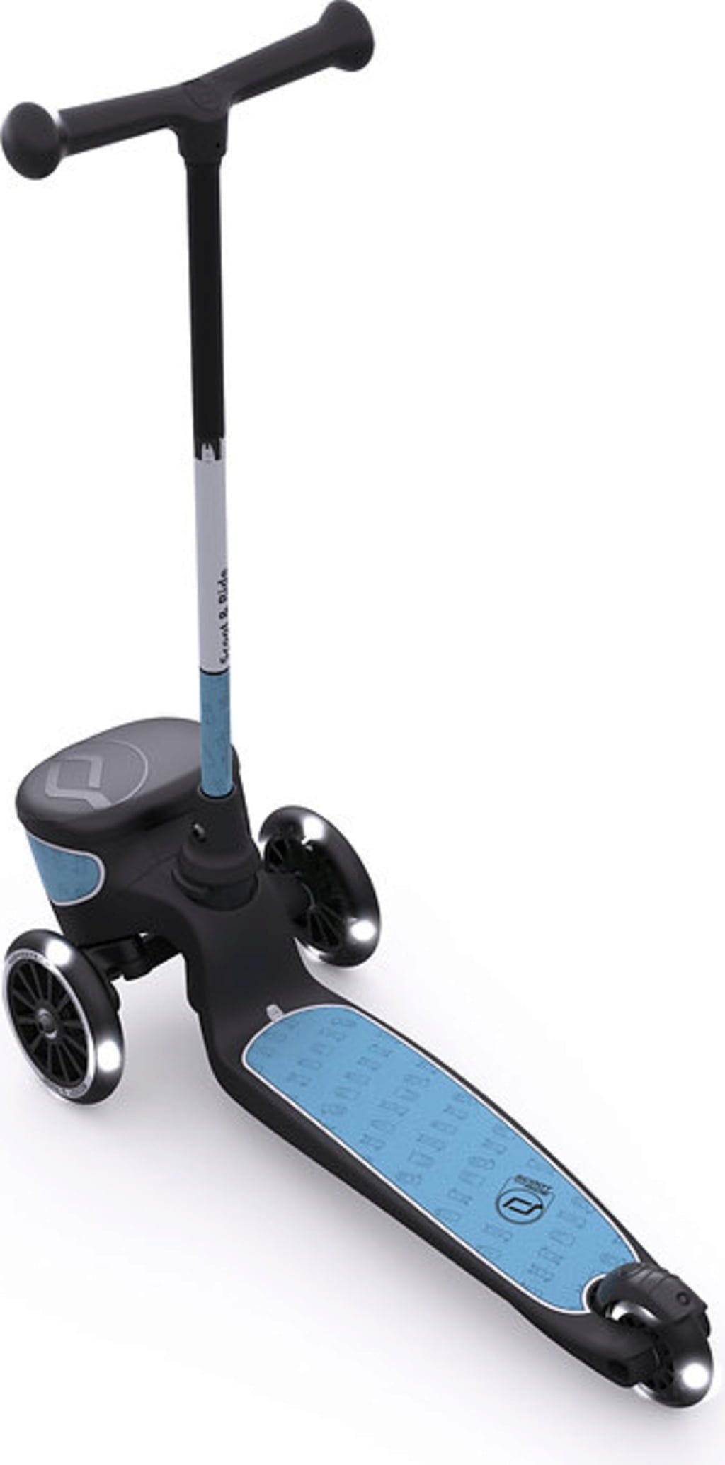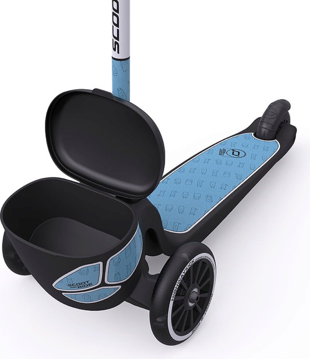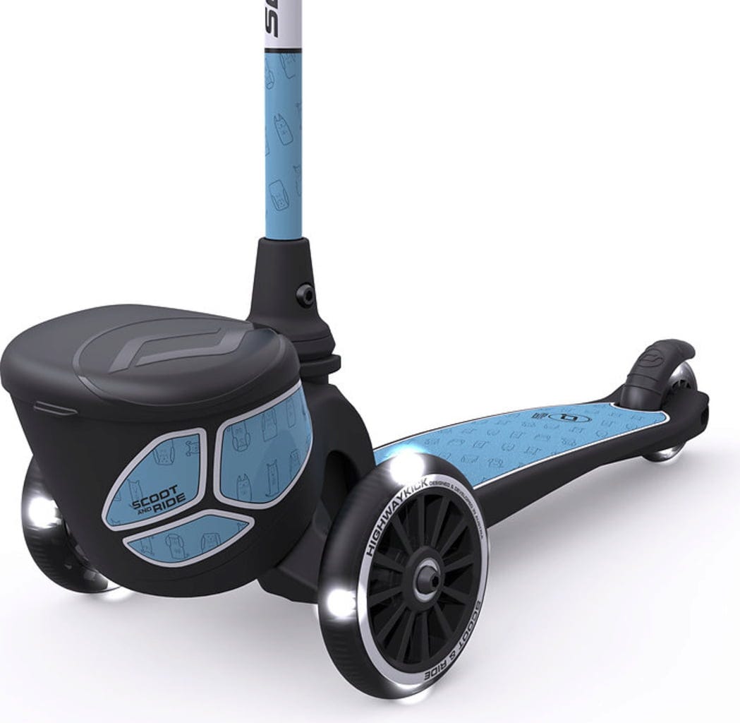 Lässiger Roller mit drei Rädern für mehr Stabilität. Das extra große Trittbrett besitzt eine griffige Beschichtung, damit man auch mit nassen Schuhen nicht abrutscht. Der Lenker ist schnell abmontiert, um den Roller leichter transportieren zu können. An der Vorderseite ist ein kleiner Behälter für die wichtigsten Dinge angebracht. LED-Räder und eine reflektierende Folierung erhöhen die Sichtbarkeit.