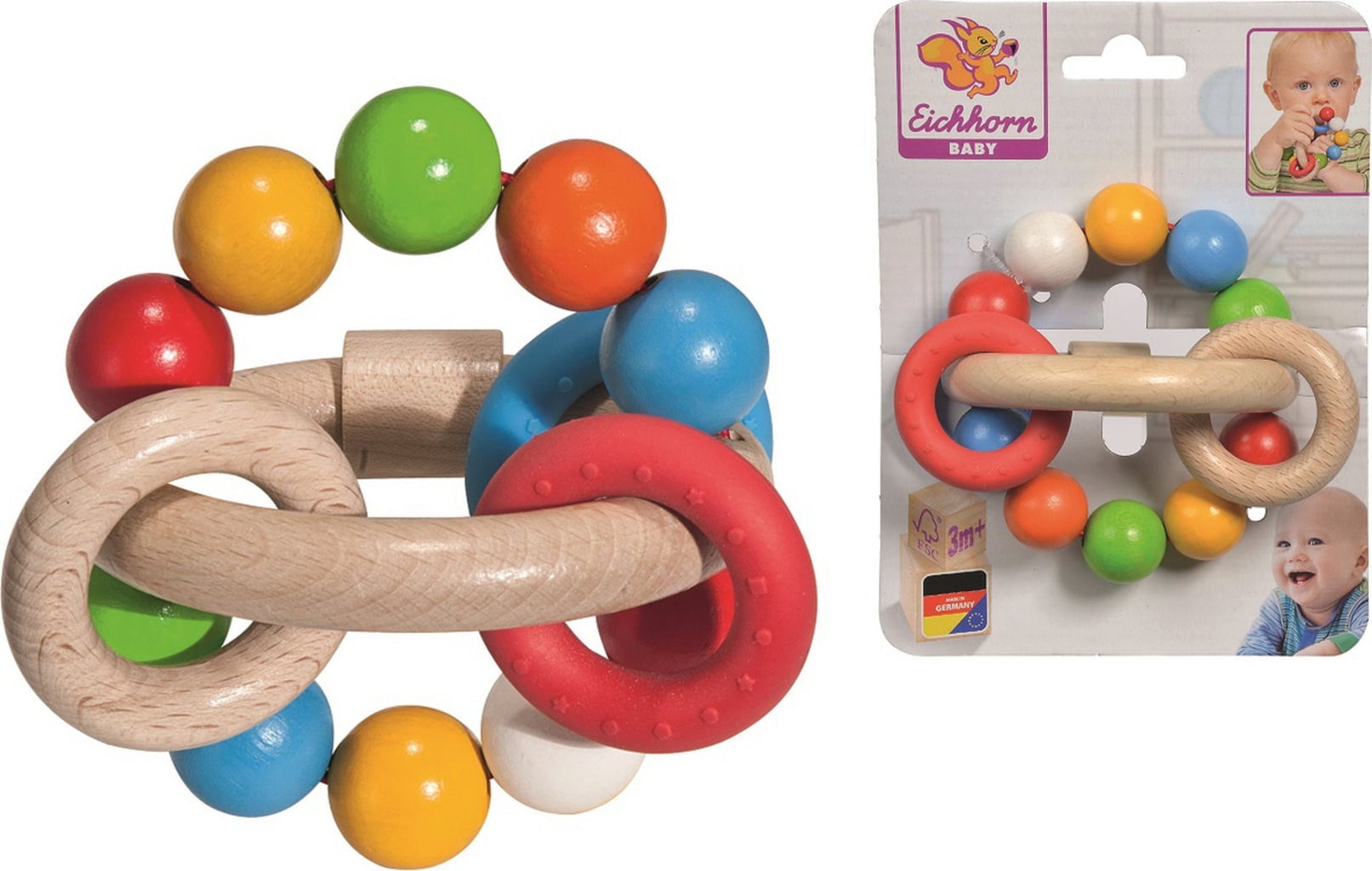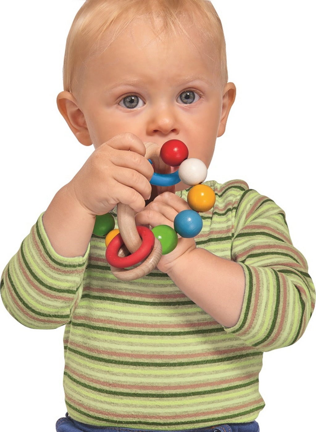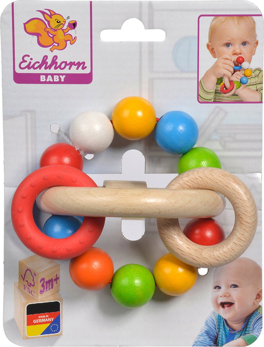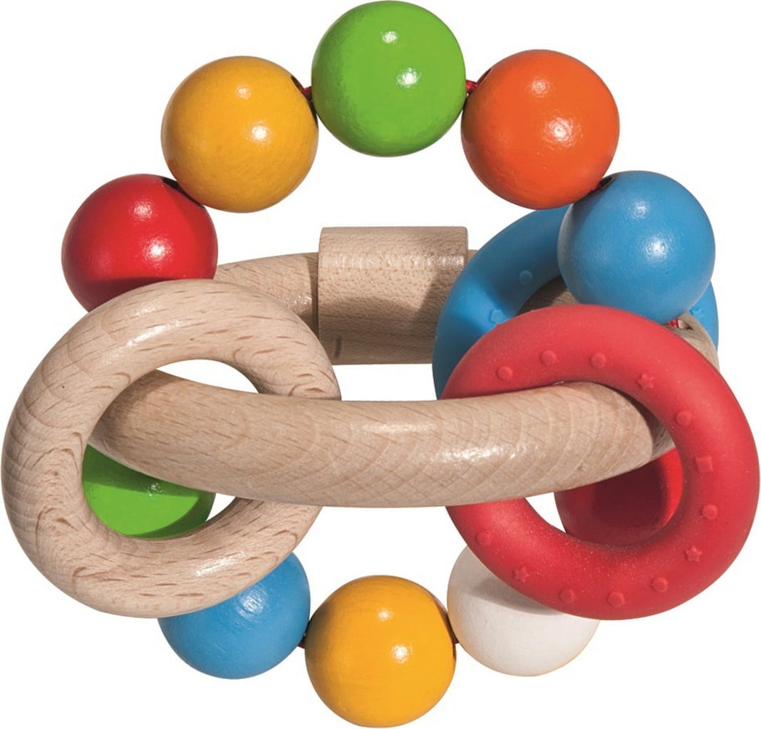 Dieser kunterbunte Greifring wird bei kleinen Entdeckern bestimmt Begeisterung auslösen. Die verschiedenen Ringe und Kugeln animieren zum Befühlen, Schütteln und Beißen. Der Ring sogt nicht nur für Spielspaß, sondern fördert zudem auch noch einige wertvolle Kompetenzen, wie etwa die Feinmotorik oder die sensorische Wahrnehmung.