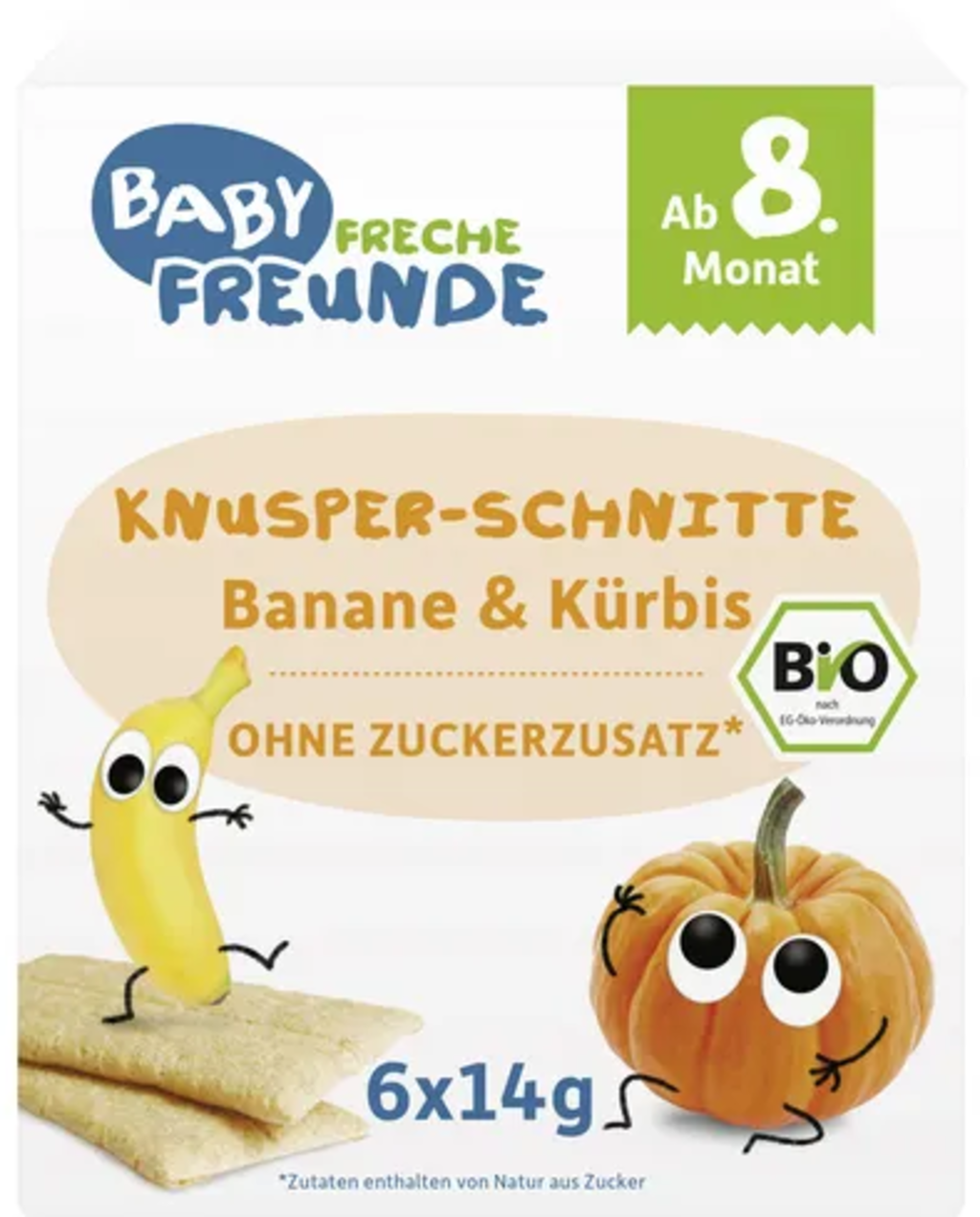 Knusper-Schnitte mit der leichten Süße von Banane und Kürbis. Dieses babygerechte Knabbergebäck sorgt für aufregende Geschmackserlebnisse. Die handlichen Schnitten laden zu ersten eigenständigen Ess-Erfahrungen ein.