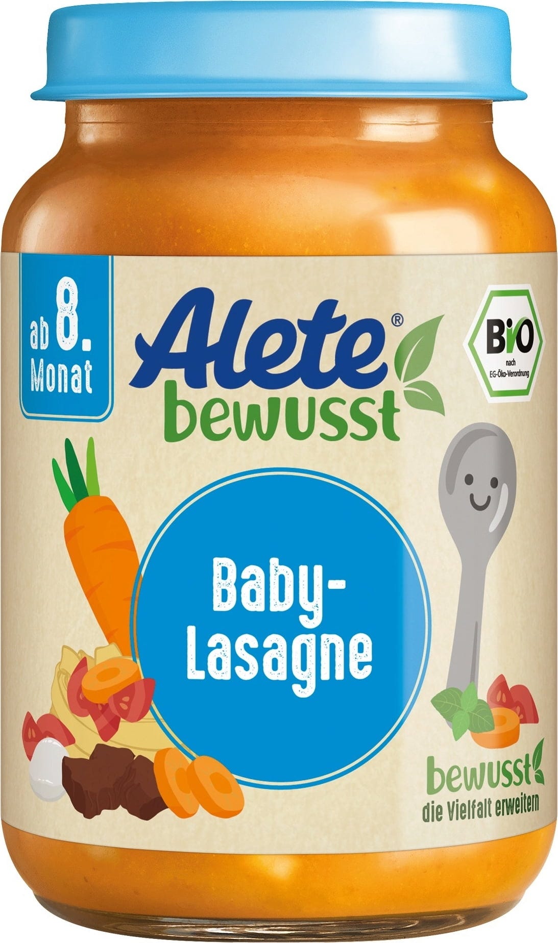 A 8 mesi i bambini hanno voglia di scoprire nuovi gusti e sono pronti per sperimentare. Alete combina ingredienti sostanziosi per introdurre consapevolmente il tuo bambino ai cibi solidi. Le Baby Lasagne contengono tenera carne di manzo biologica, morbida pasta, verdure tipiche ed erbe aromatiche selezionate in piccoli pezzi. Naturalmente Alete non utilizza zuccheri aggiunti, aromi, coloranti o conservanti nella sua ricetta.