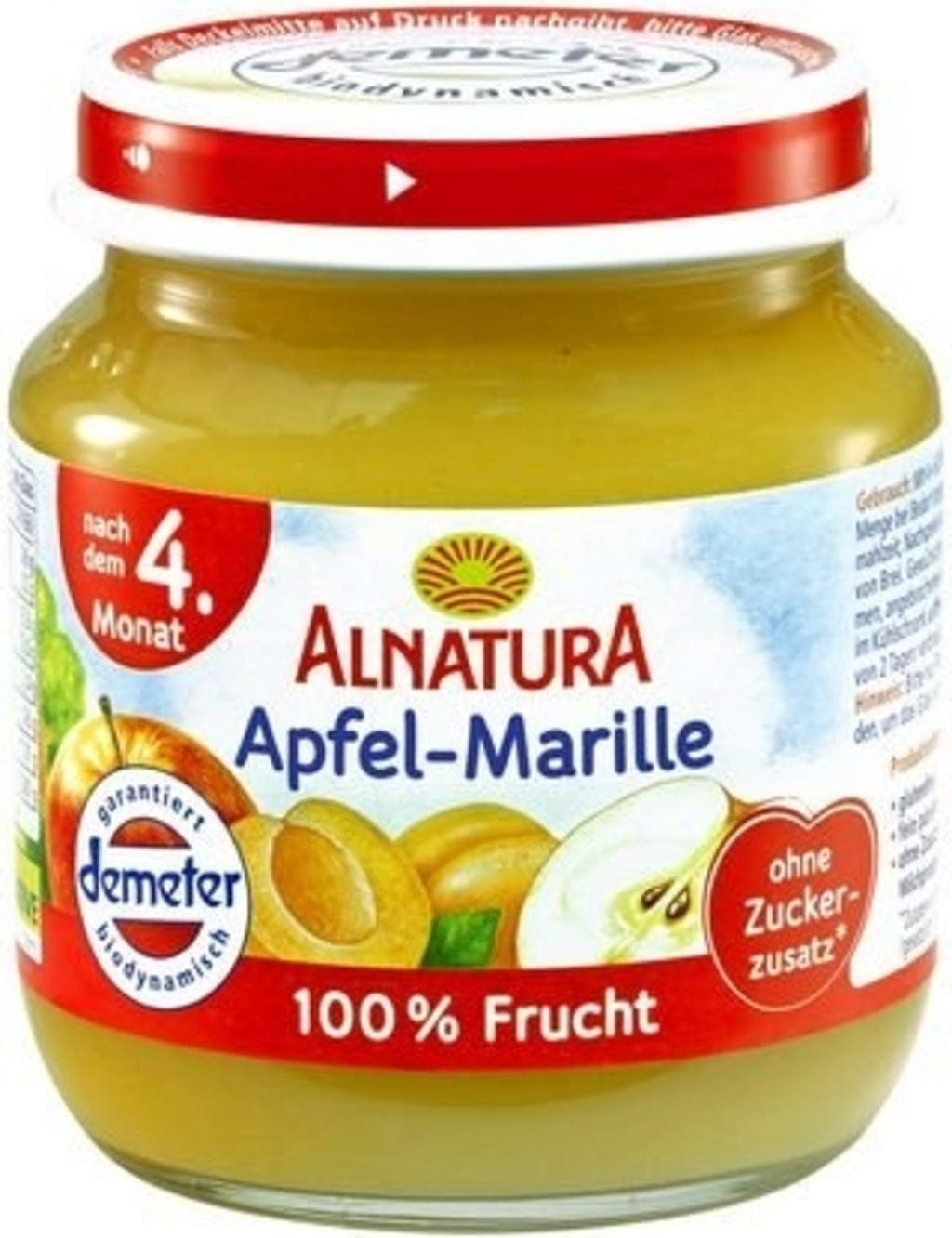 Questo vasetto contiene solo mele e albicocche finemente frullate provenienti da coltivazione biologica certificata Demeter. Un mix perfetto sia da solo come spuntino che in aggiunta alla pappa lattea o alla crema di cereali per lo svezzamento. La ricetta è senza glutine e senza zucchero ed è adatta a partire dal 4° mese di età.