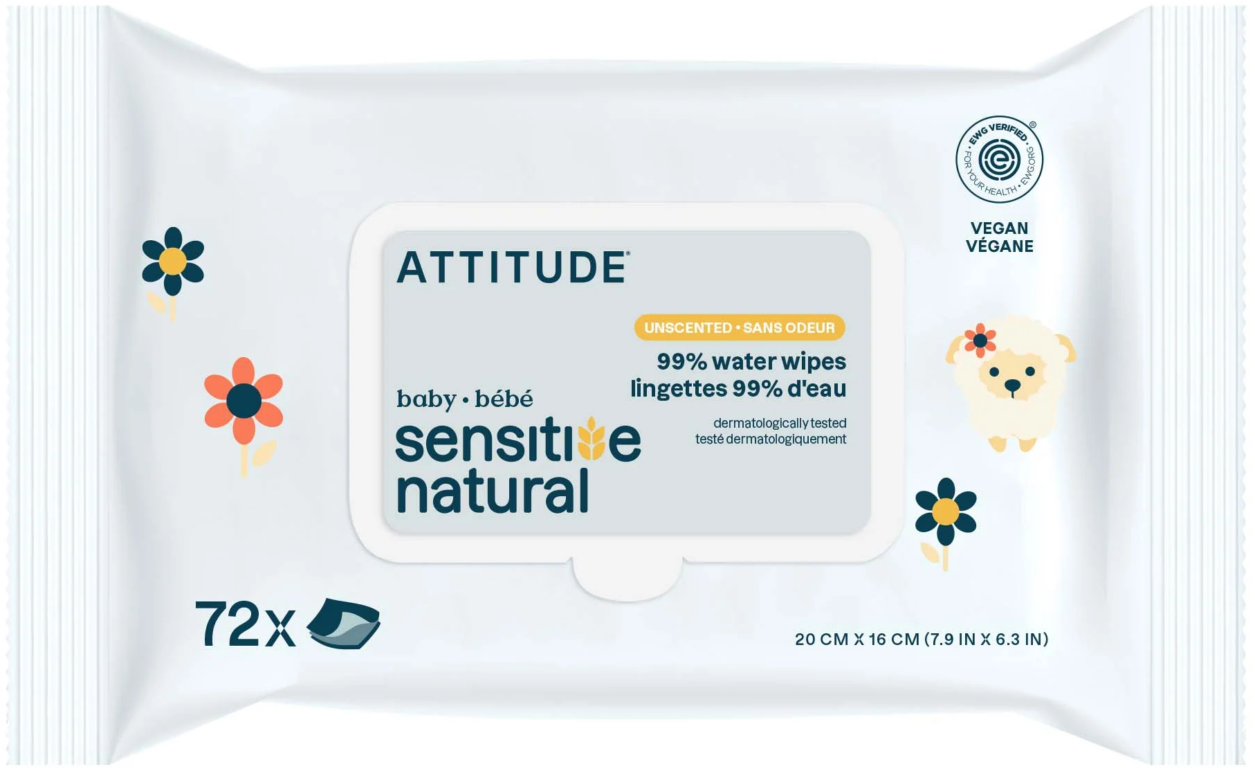 Le salviette ATTITUDE sono composte al 100% da cellulosa vegetale. Particolarmente delicate per la pelle del bambino, sono ideali per la pulizia veloce del bambino quando si è fuori casa.