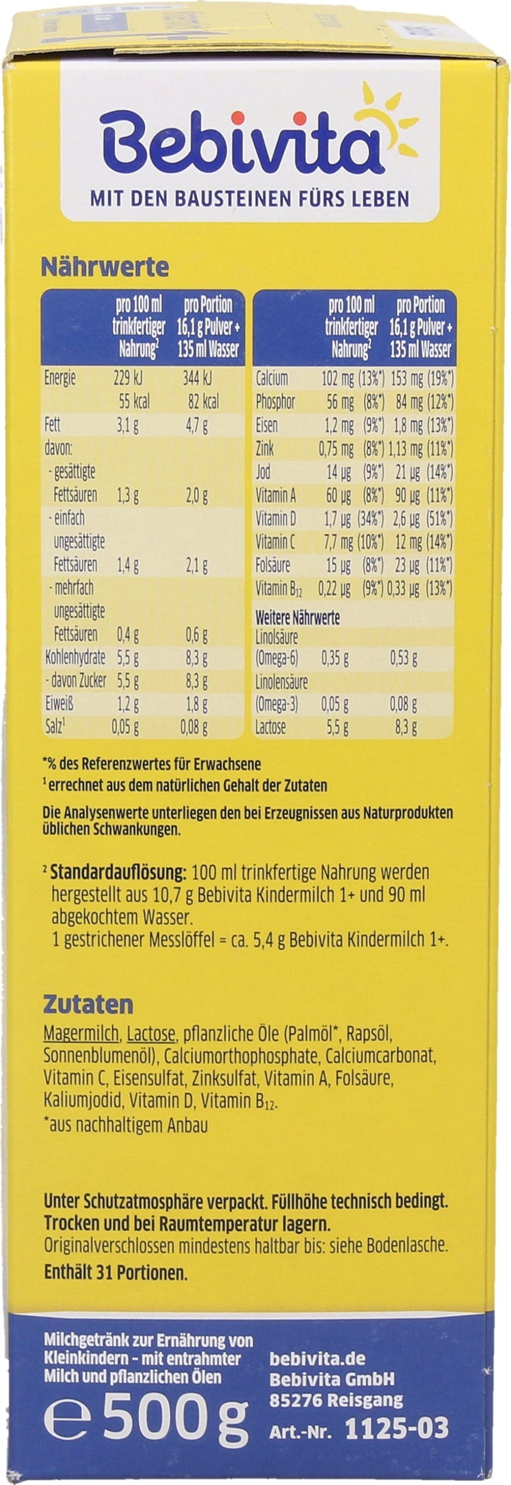 Questo latte di crescita di Bebivita è adatto ai bambini da 1 anno in su e può essere consumato sia fuori pasto che durante i pasti principali servendolo in una tazza o un bicchiere. Il latte appositamente formulato è a base di ingredienti accuratamente selezionati e contiene ferro, calcio, proteine ridotte adatte ai bambini, iodio e vitamine C e D.