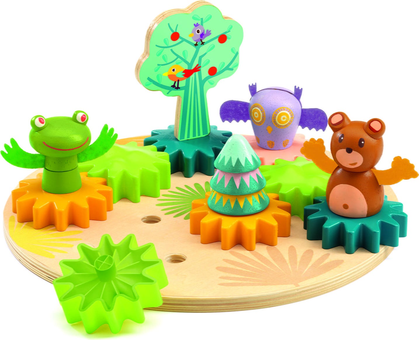 Metti gli ingranaggi nei fori giusti e guarda emergere una colorata foresta da favola. Animali divertenti si nascondono tra alberi e cespugli. Se poi giri gli ingranaggi, le cose si muoveranno e gli amici della foresta prenderanno vita. Questo giocattolo di alta qualità allena l'osservazione e le capacità motorie.