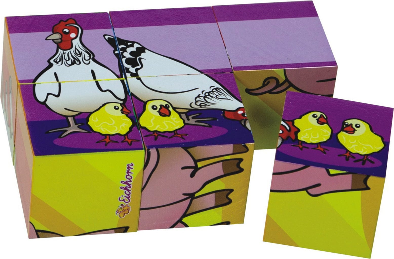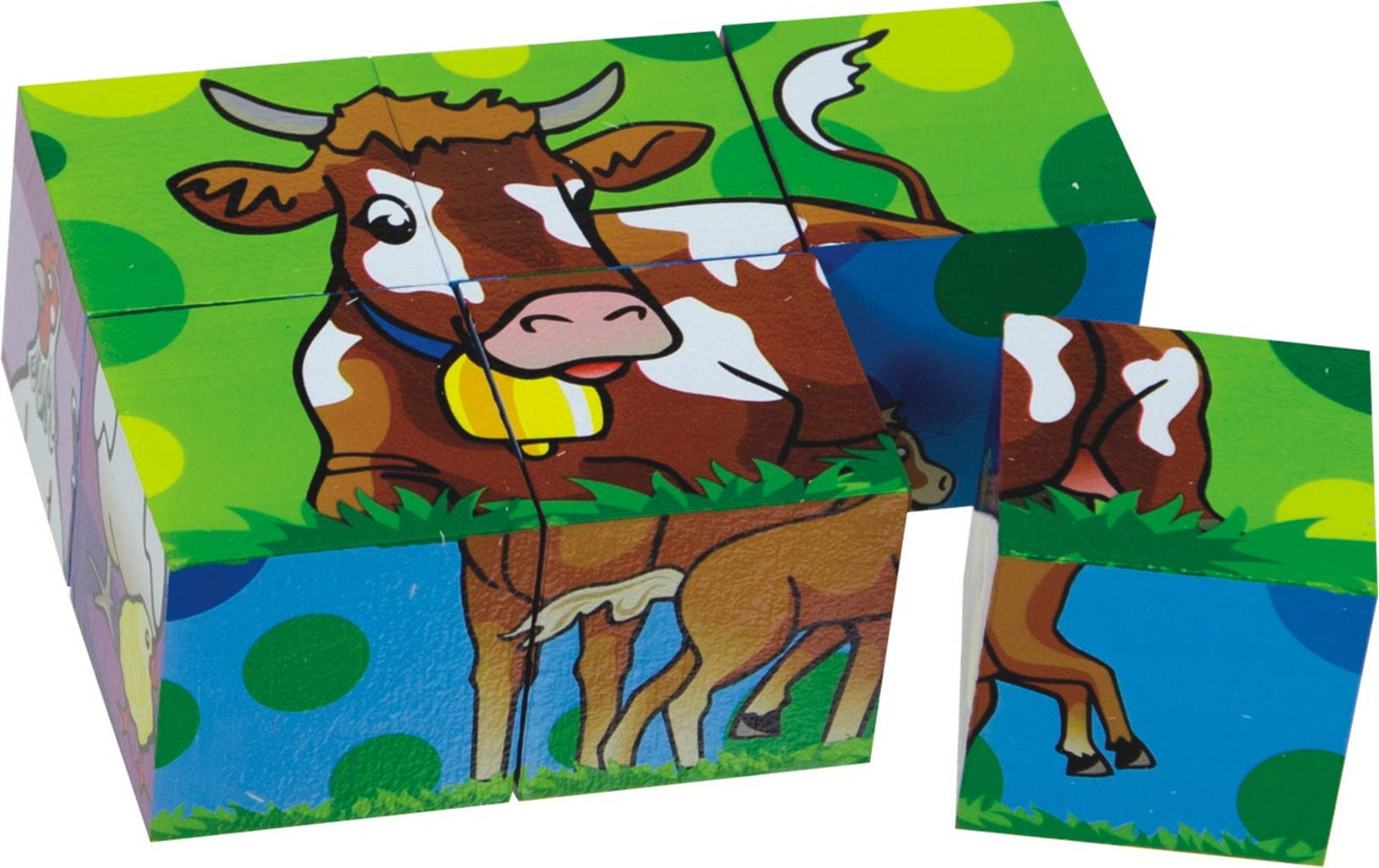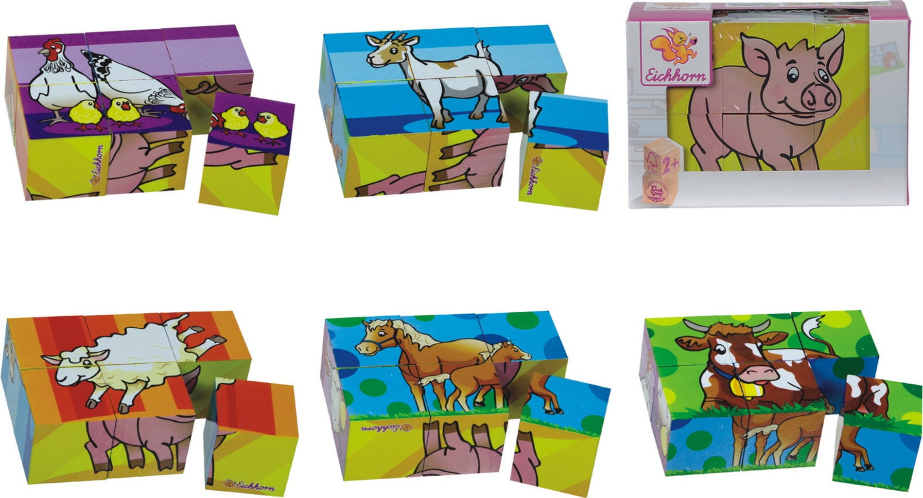 I sei cubi di questo grande puzzle possono essere disposti in motivi colorati raffiguranti simpatici animali della fattoria. Quando si costruisce e si gioca con i cubi, si allena anche la coordinazione occhio-mano in modo giocoso.