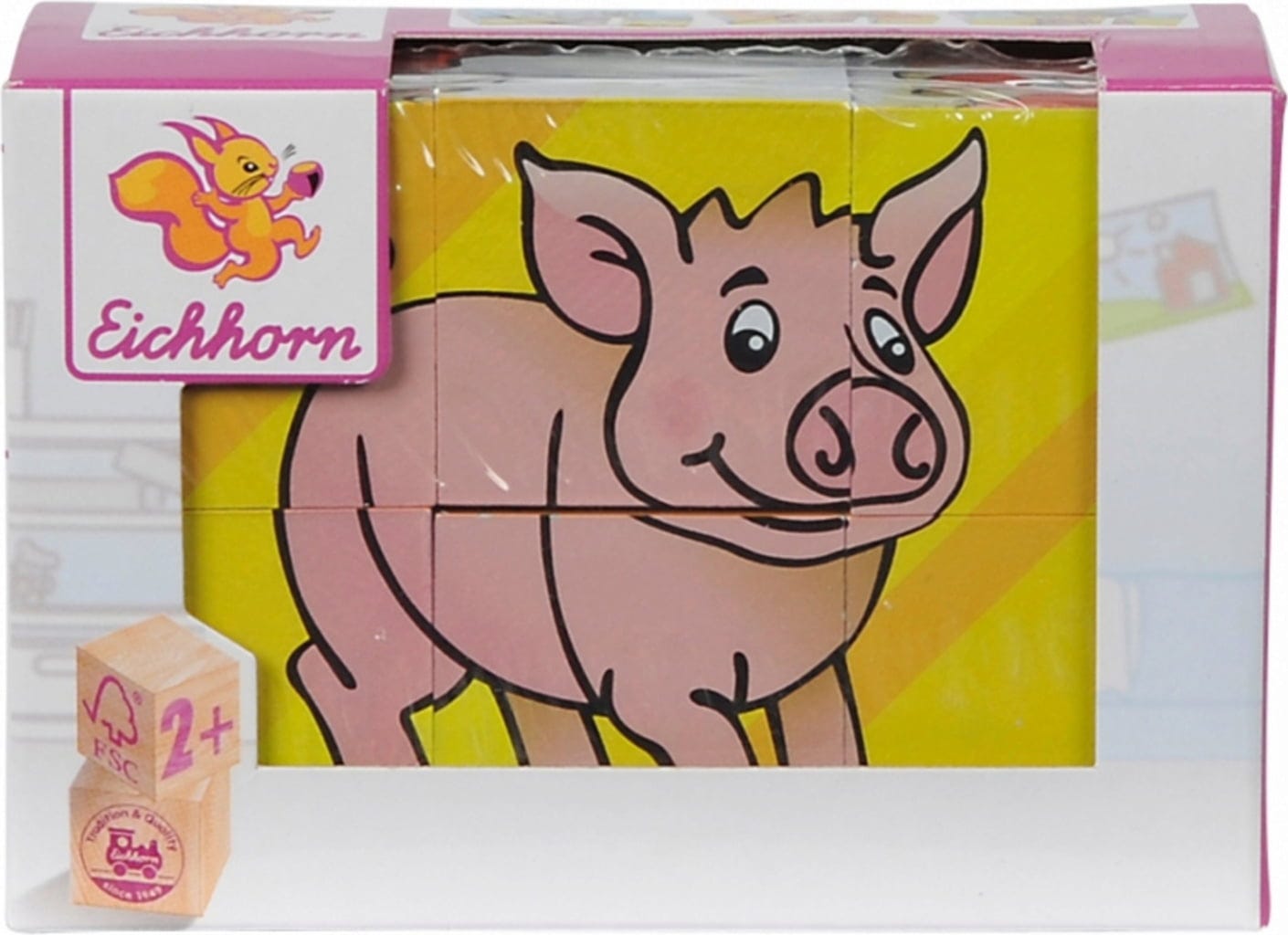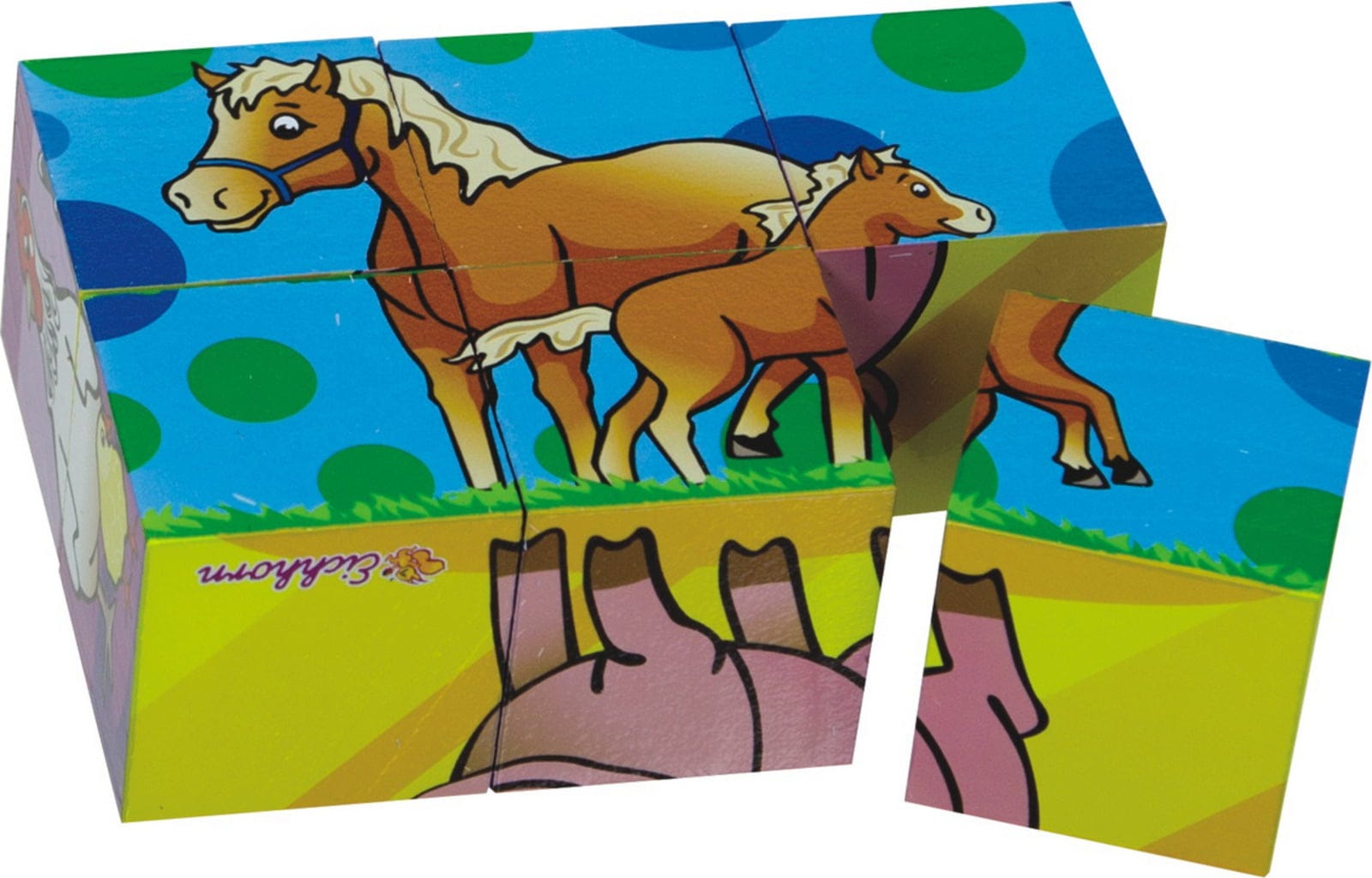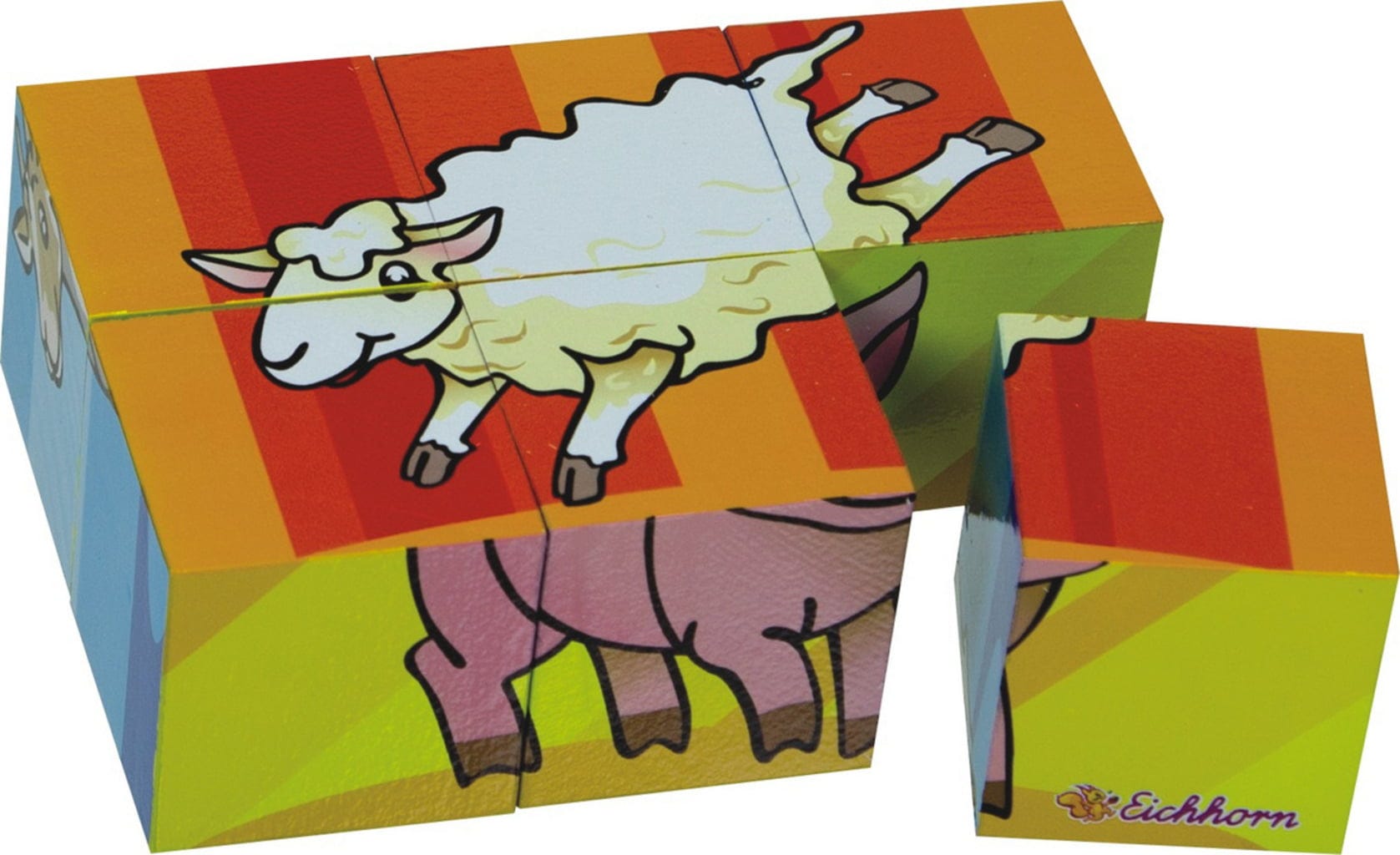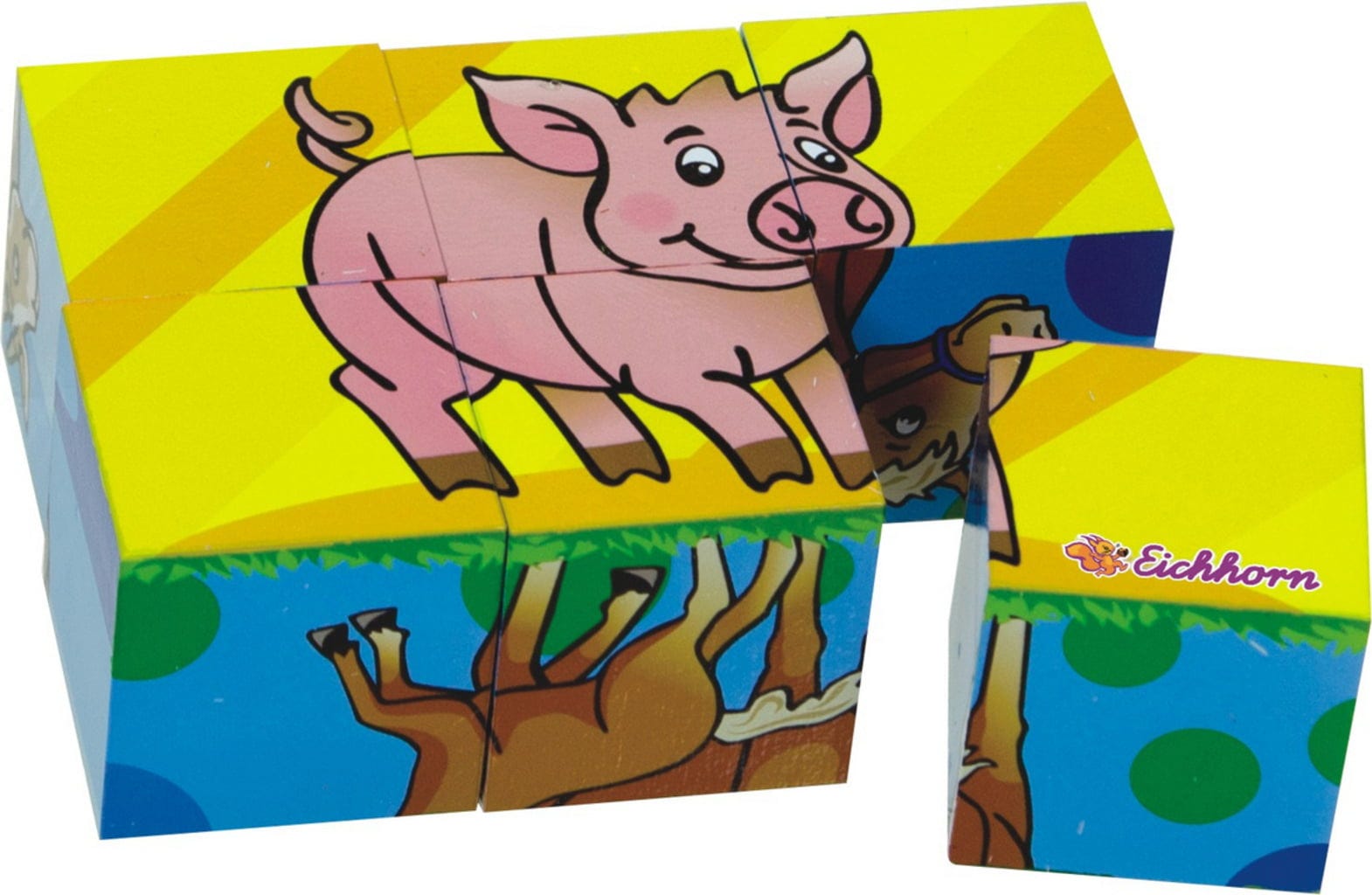 I sei cubi di questo grande puzzle possono essere disposti in motivi colorati raffiguranti simpatici animali della fattoria. Quando si costruisce e si gioca con i cubi, si allena anche la coordinazione occhio-mano in modo giocoso.