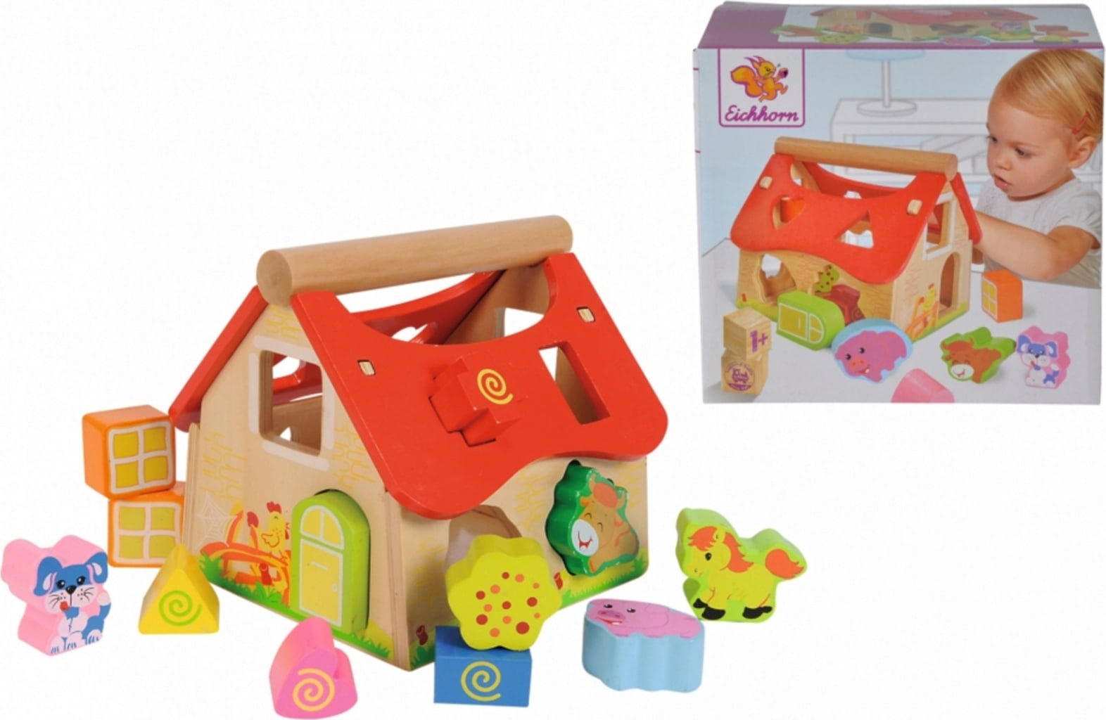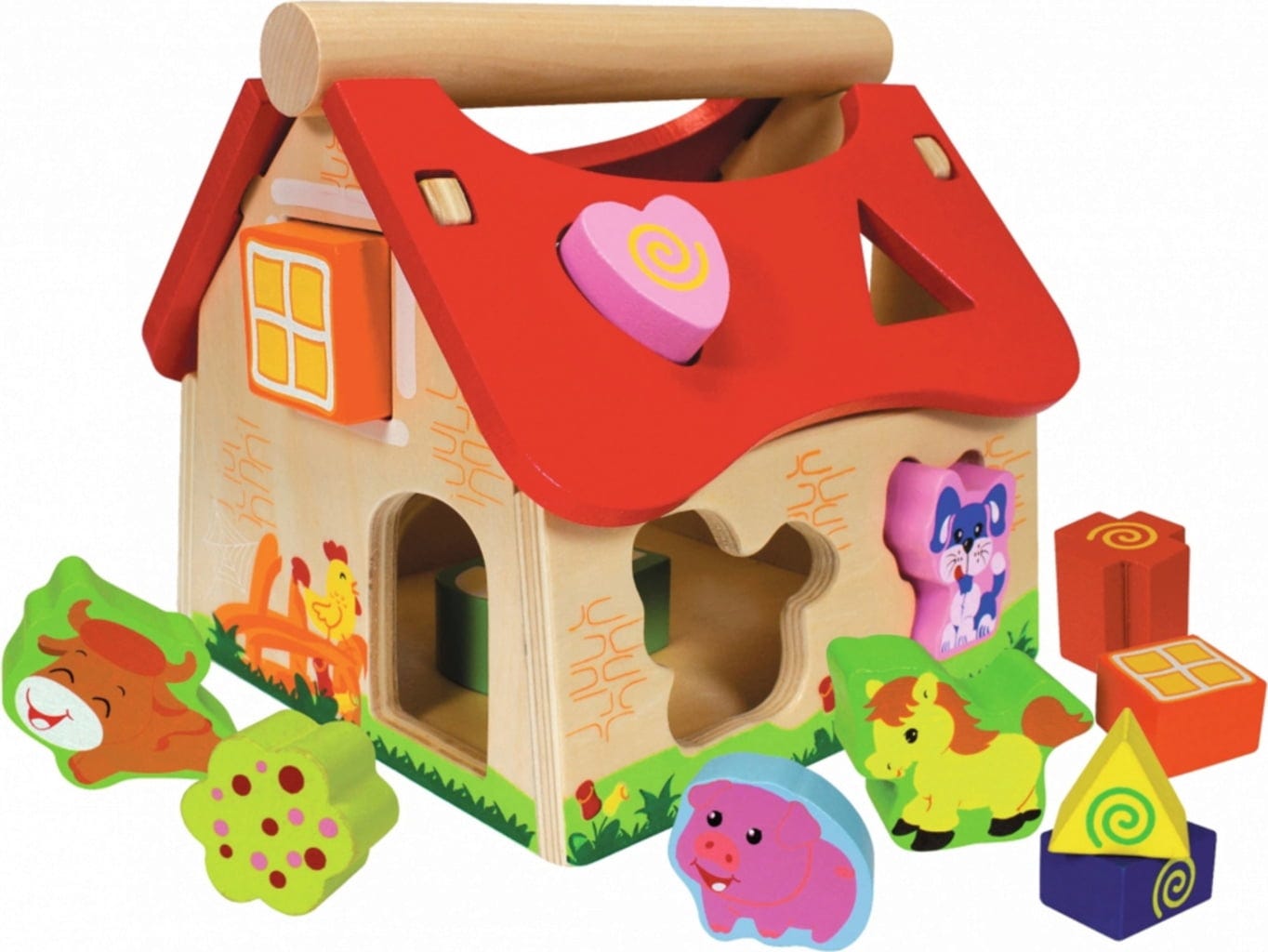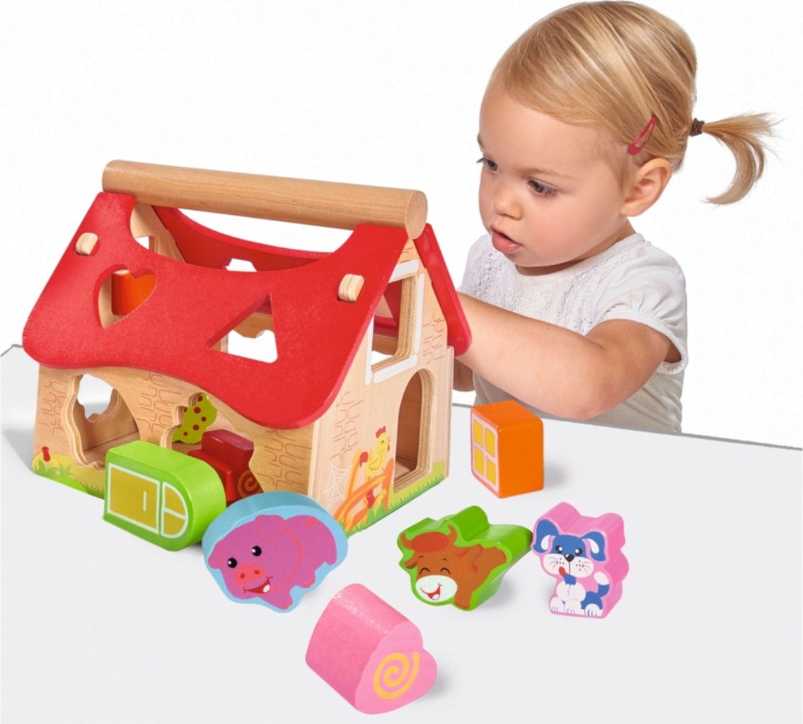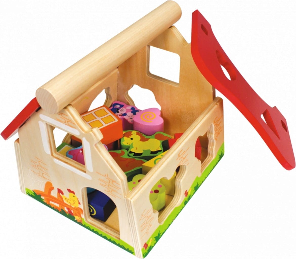 Questa casa di alta qualità garantisce ore di divertimento ai piccoli amanti degli animali. I mattoncini di diversa forma con motivi animali possono essere inseriti all'interno della casa attraverso le apposite aperture, ma possono anche essere usati come personaggi in svariati giochi basati sul tema della fattoria. Il tetto può essere facilmente rimosso per poter tirare fuori i blocchi inseriti nella fattoria.