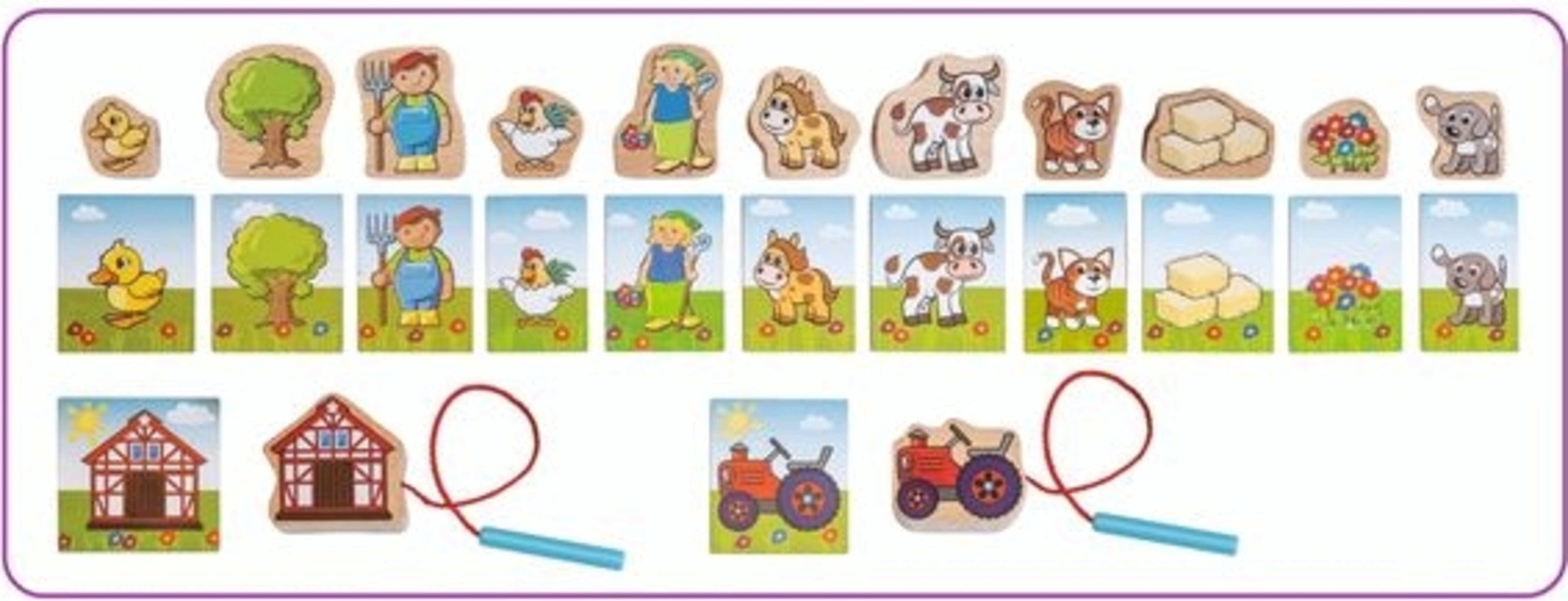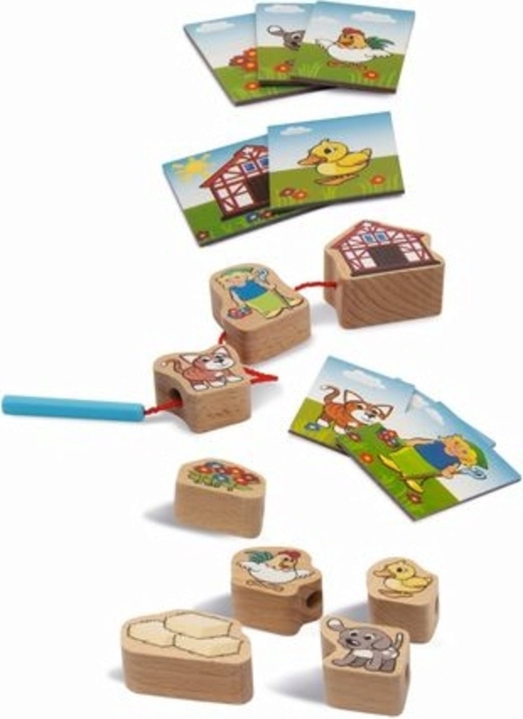 Nella fattoria ci sono tante cose da scoprire. Con questo gioco, i bambini possono utilizzare le 13 schede come ispirazione o infilare gli 11 elementi come preferiscono. In entrambi i casi, il risultato è una storia emozionante fatta di simpatiche immagini.