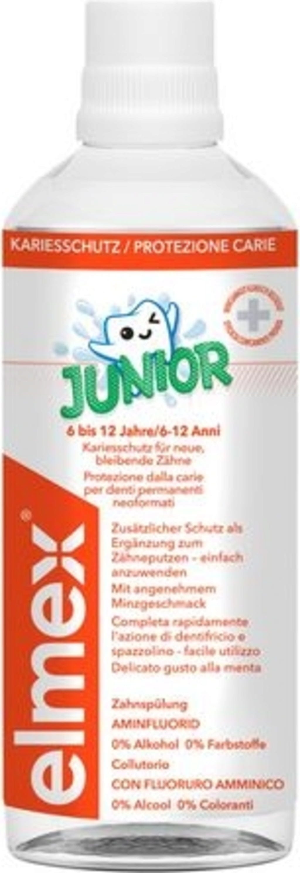 Junior - Collutorio di elmex® è un prodotto arricchito con fluoro, che crea un efficace scudo protettivo. Rafforza i denti e previene in modo efficace la formazione di carie.