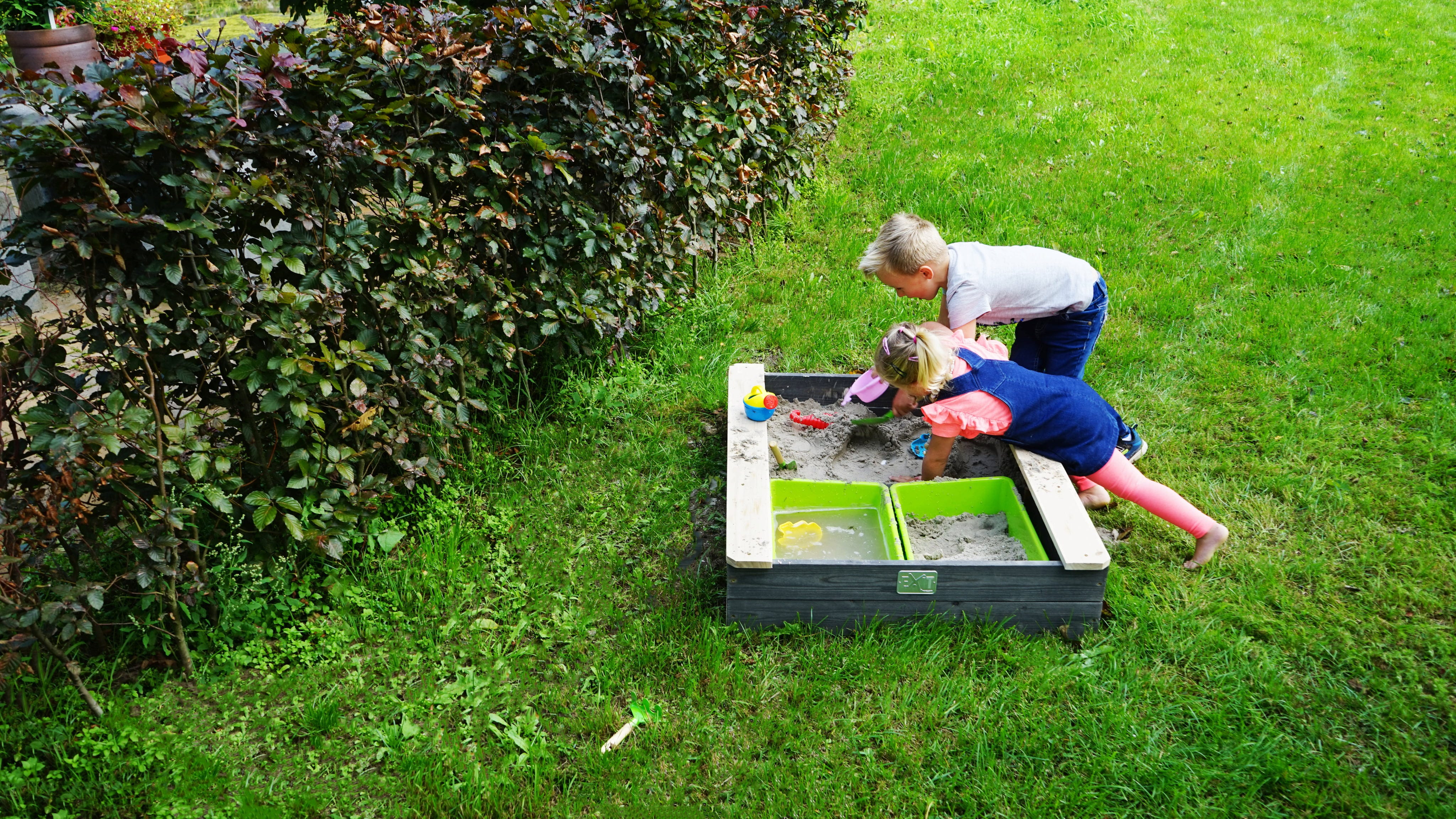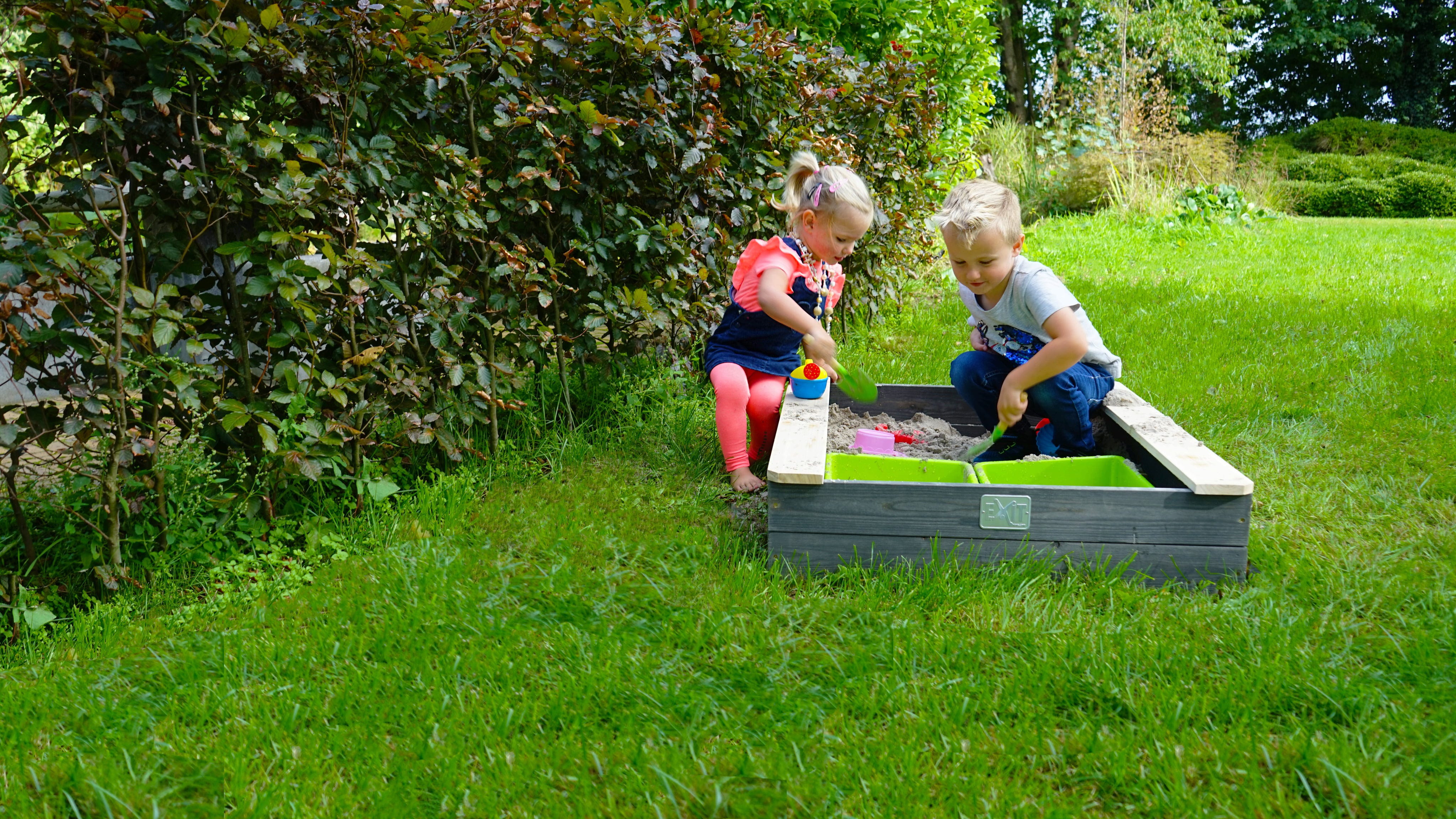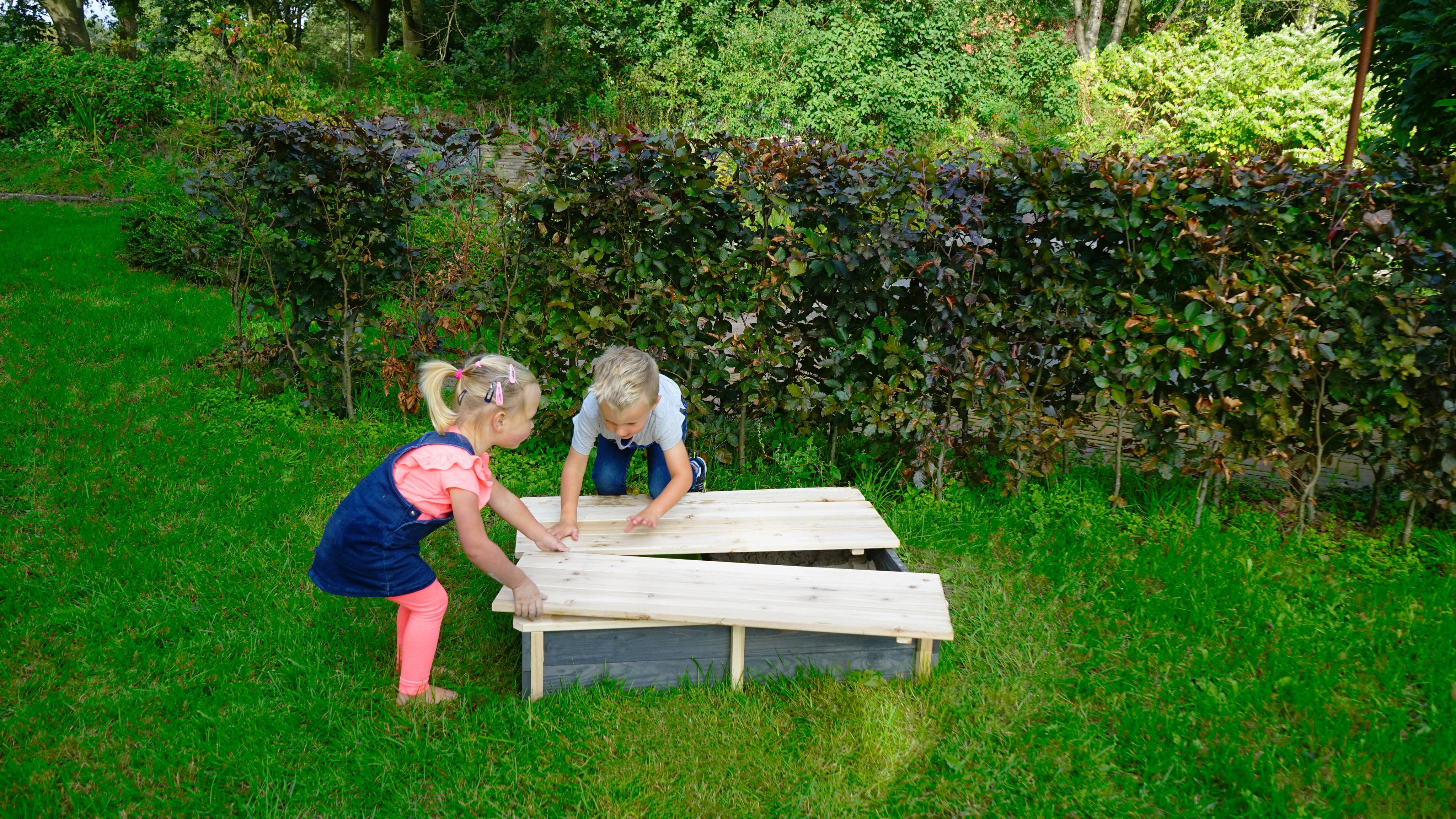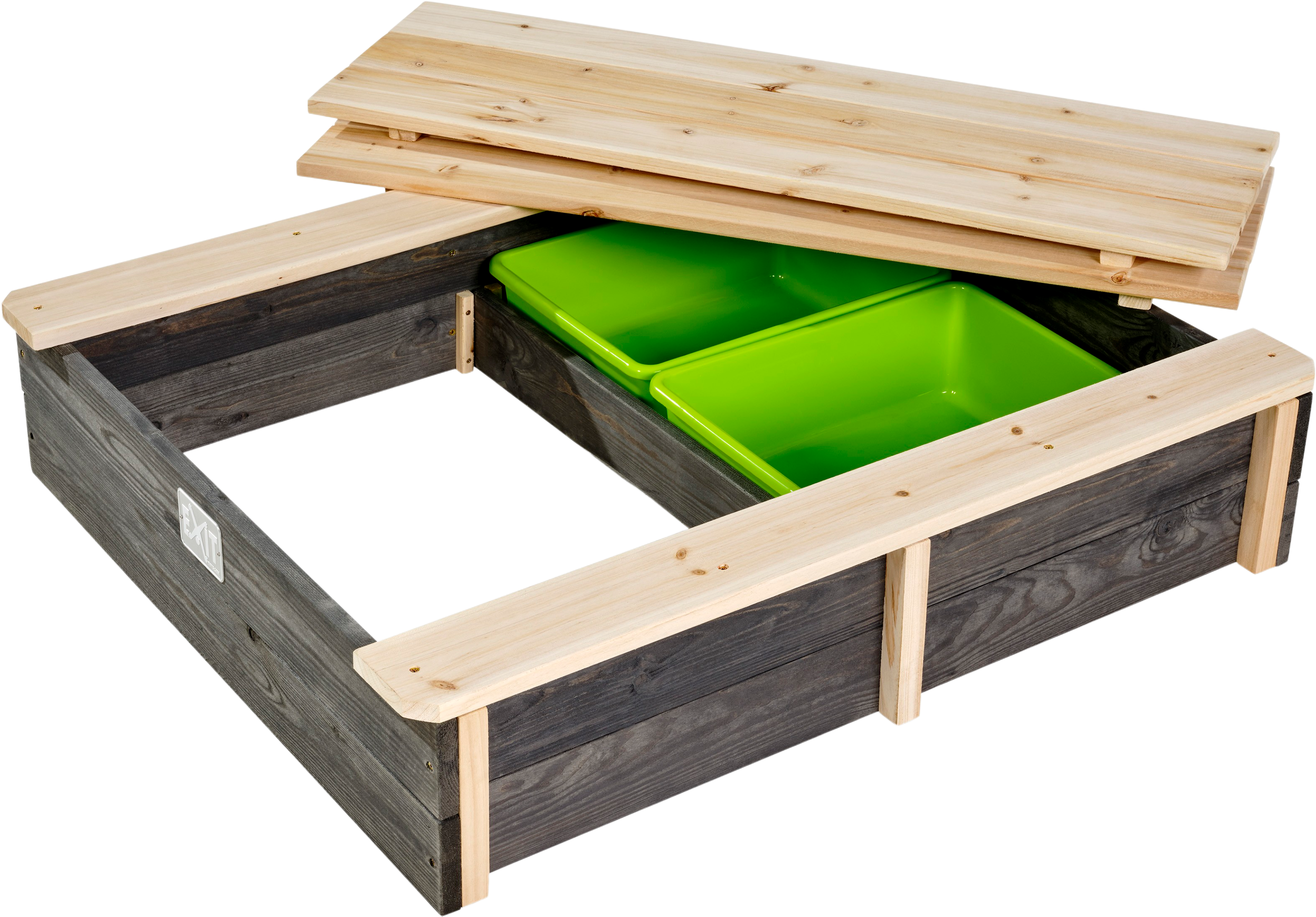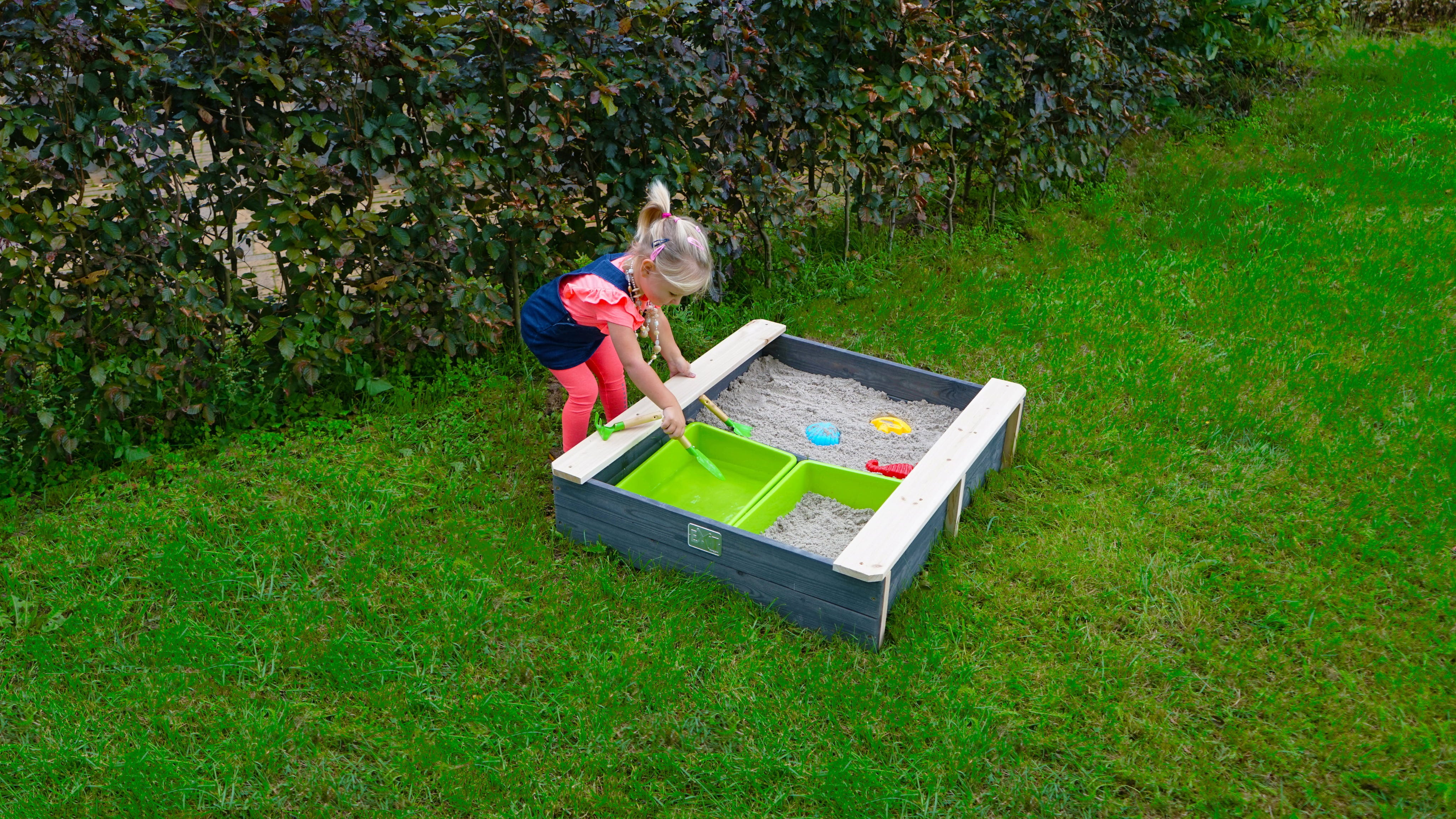 La sabbiera in legno è dotata di due panche sui lati e di due pratici contenitori verdi che possono essere riempiti d'acqua in estate, per massimizzare il divertimento nella sabbiera. Questi contenitori sono estraibili e quindi facili da pulire; inoltre, quando la sabbiera non è in uso, offrono anche spazio per i giocattoli. La pratica copertura in legno protegge la sabbia e i giocattoli dallo sporco e dagli agenti atmosferici.