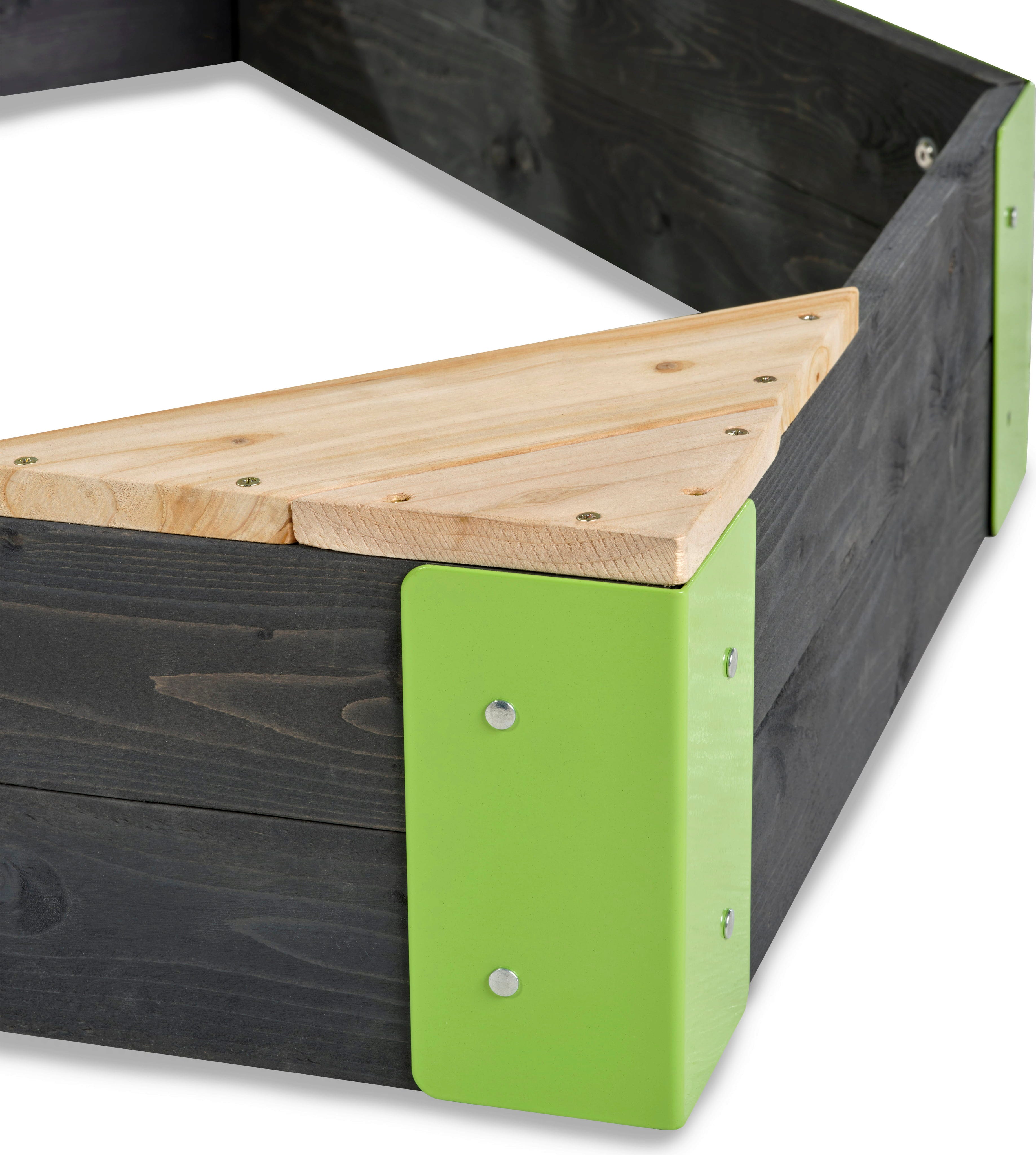Particolarmente pratico: la sabbiera in legno è dotata di assi preforate, rendendo il montaggio molto semplice. Viene consegnata con ganci e raccordi metallici, che garantiscono la stabilità necessaria. Il legno grigio e gli angoli verdi sottolineano perfettamente il design moderno della sabbiera.