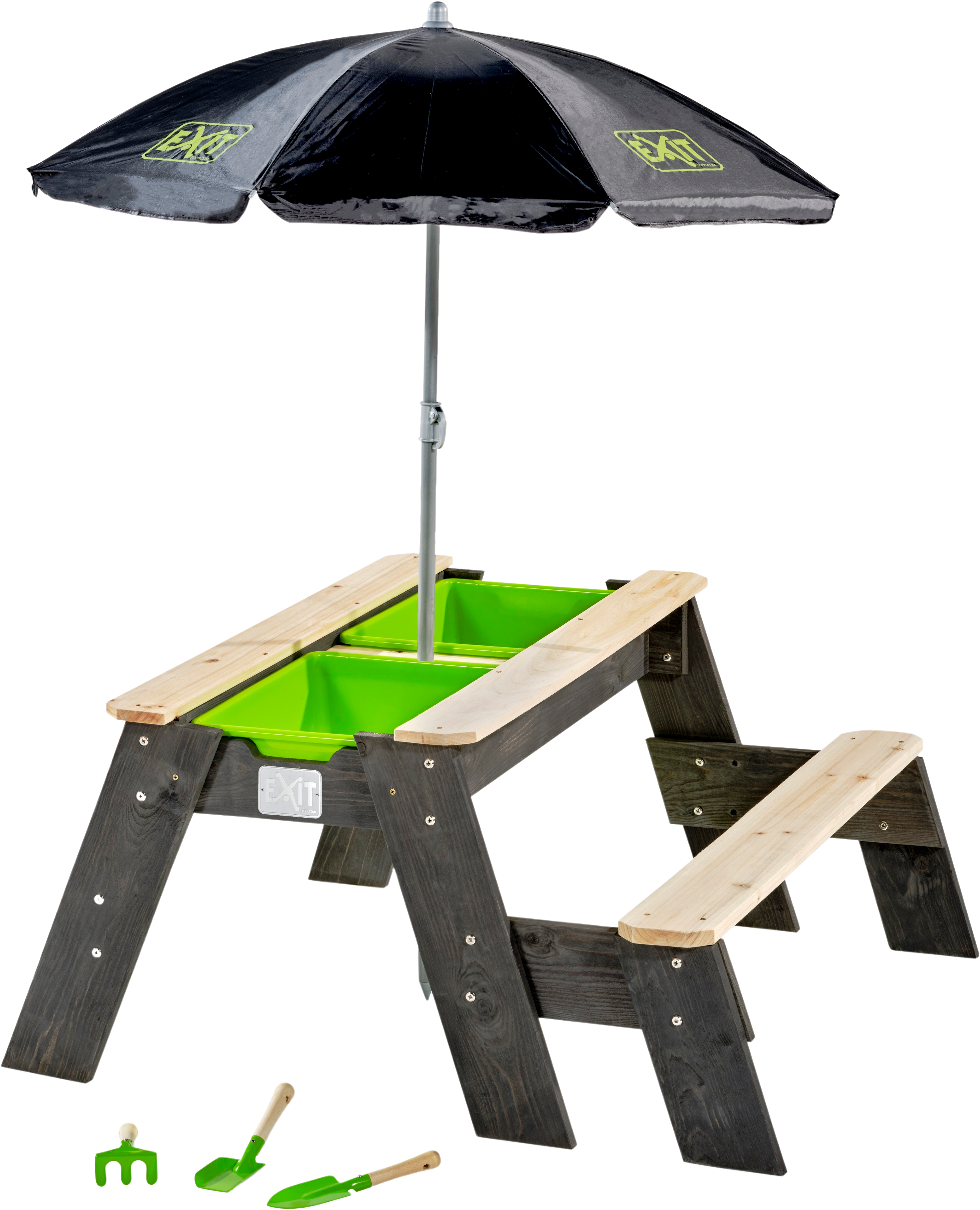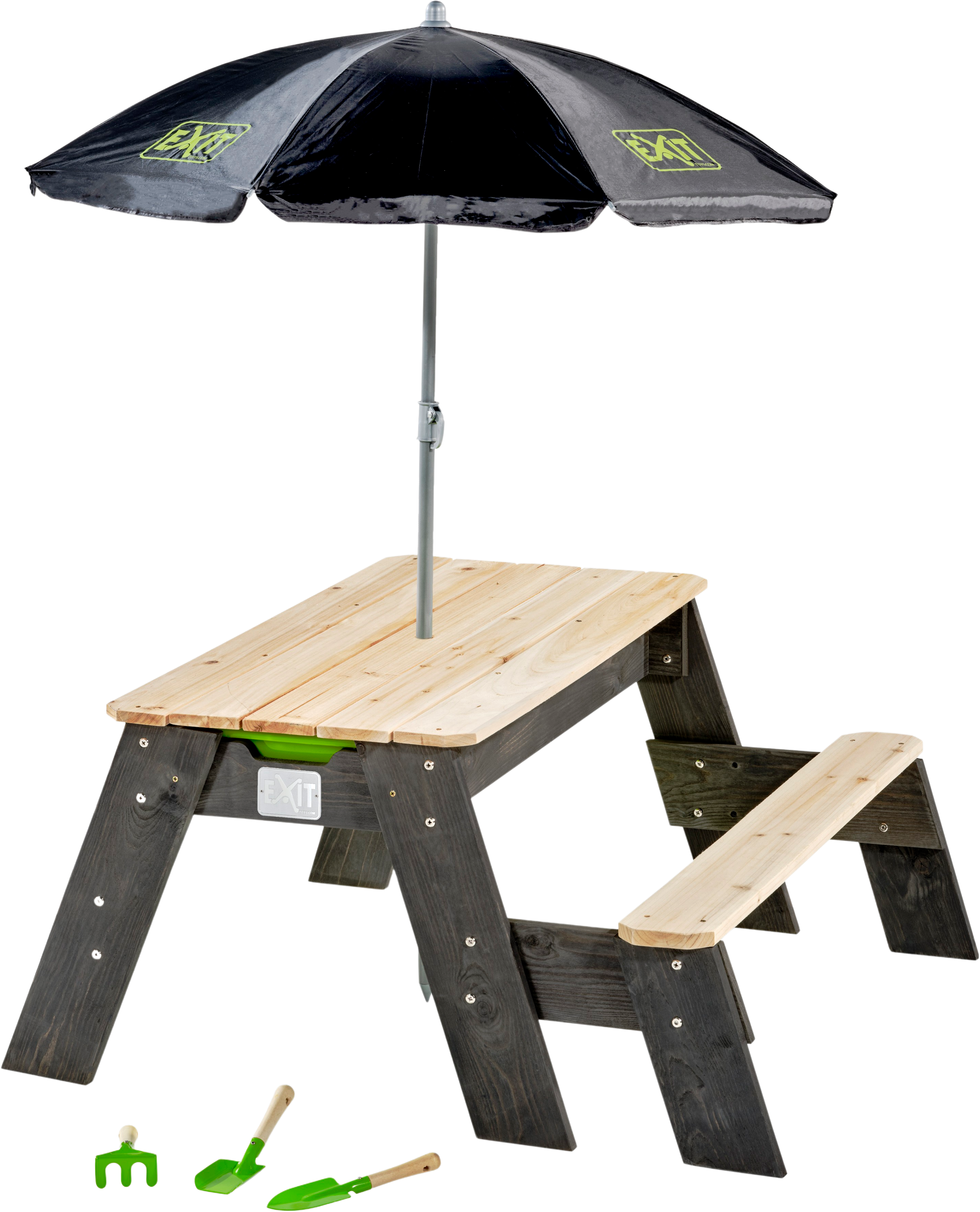 Exit Toys Aksent - Tavolo da Picnic e da Gioco per Sabbia e Acqua - 1 Panca con Ombrellone e Utensili da Giardinaggio
