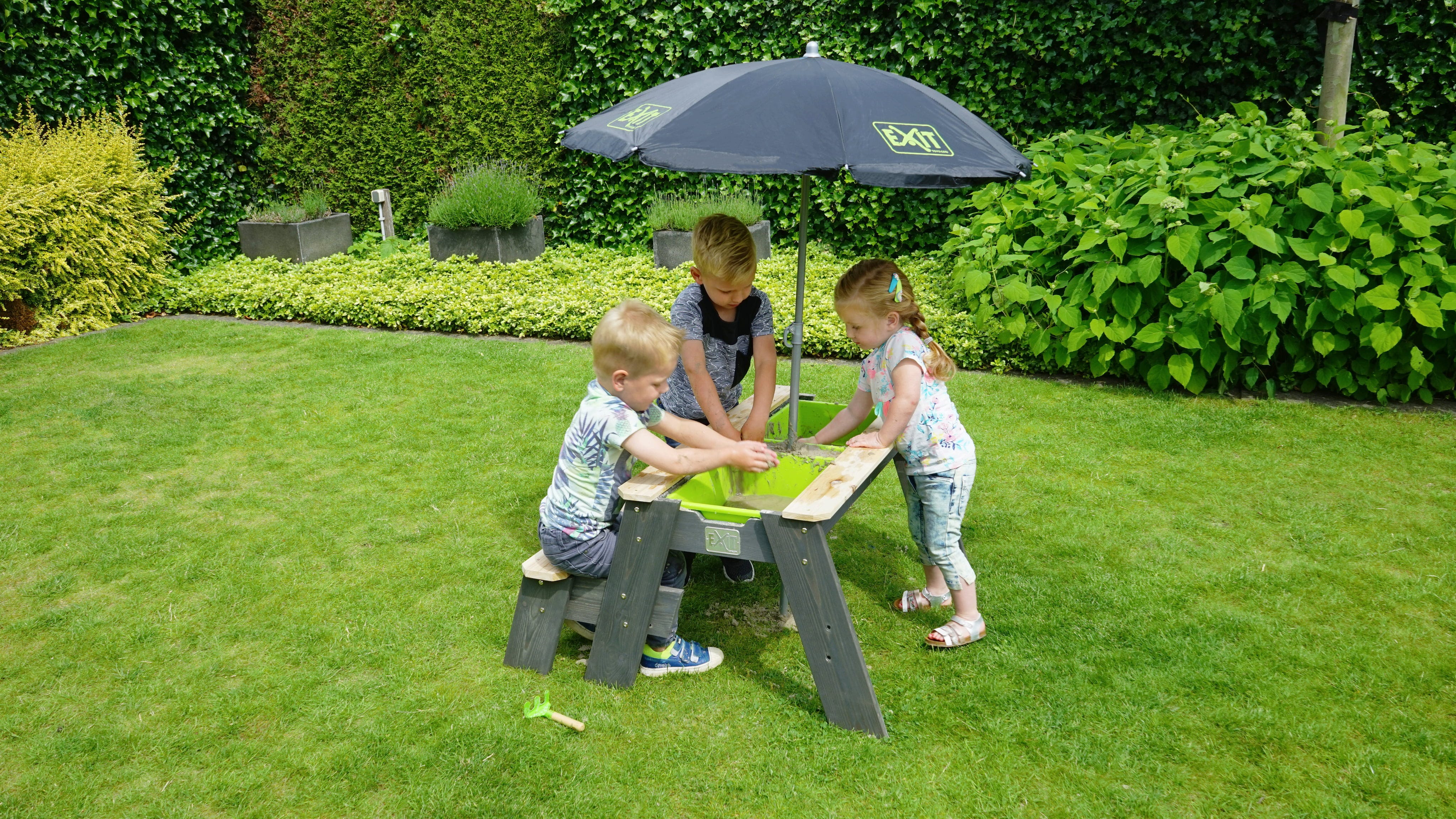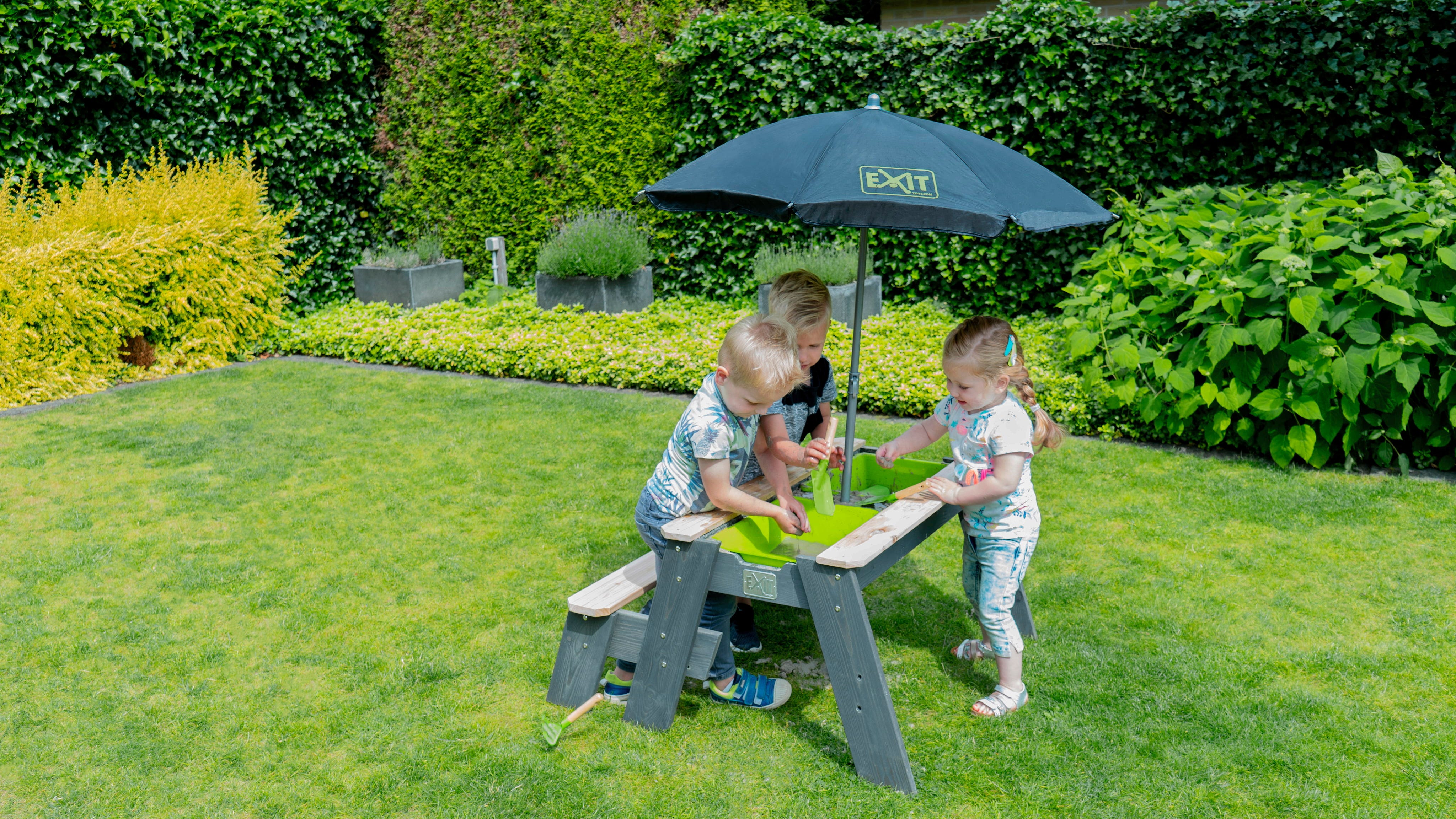 Il tavolo da picnic e da gioco per sabbia e acqua Aksent di Exit Toys è un vero tuttofare per il divertimento estivo in giardino. Il pratico tavolo è dotato di una comoda panca che invita a giocare a lungo e di un ombrellone che protegge i bambini dal sole mentre giocano. Nella fornitura sono inclusi anche pratici utensili da giardino e due contenitori verdi che possono essere fissati al piano del tavolo. I contenitori possono essere riempiti con acqua o sabbia, a seconda delle preferenze, per un divertimento senza limiti. Naturalmente i contenitori possono anche essere coperti con un coperchio, così da poter utilizzare la superficie del tavolo per dipingere, fare spuntini o giocare a giochi da tavolo.