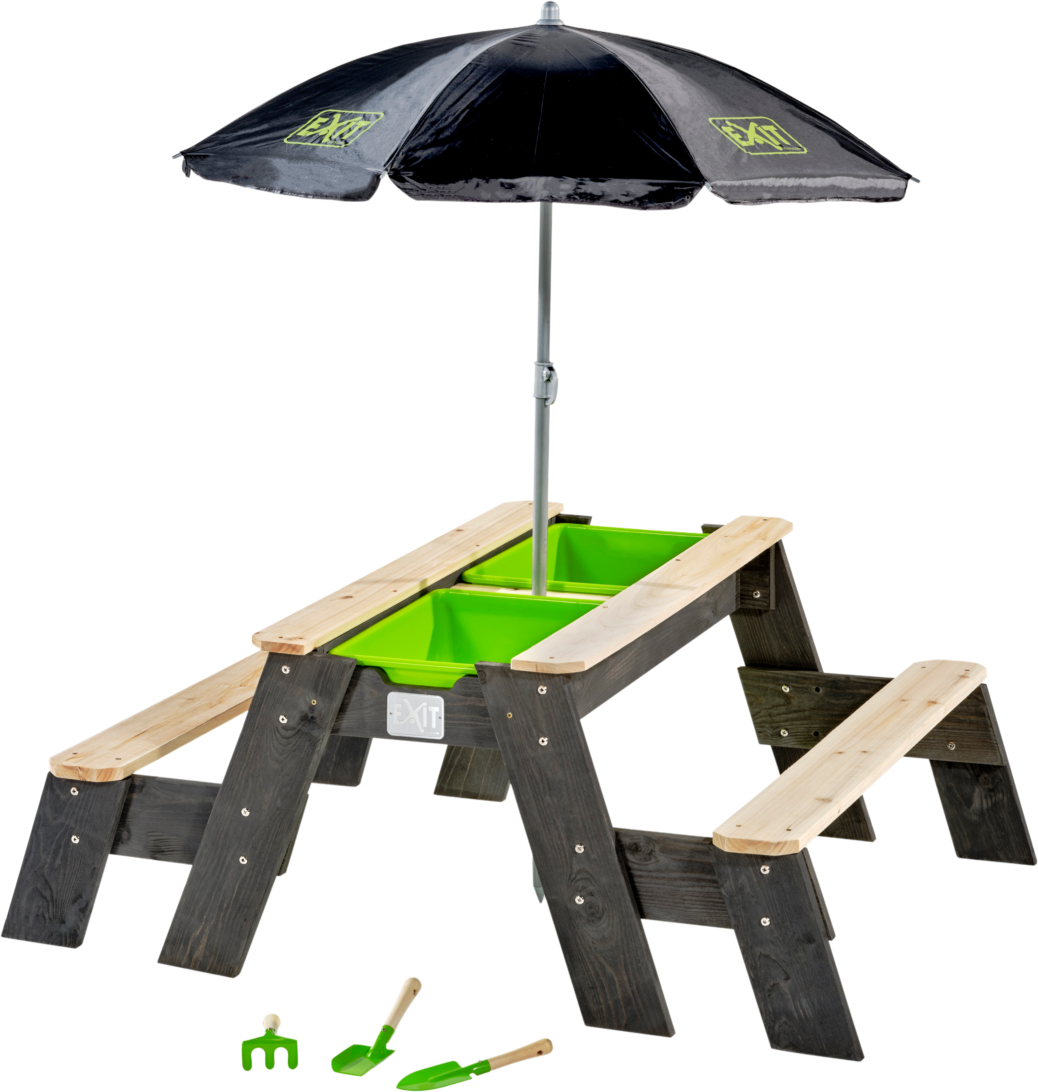 Exit Toys Aksent - Tavolo da Picnic e da Gioco per Sabbia e Acqua - 2 Panche con Ombrellone e Utensili da Giardinaggio