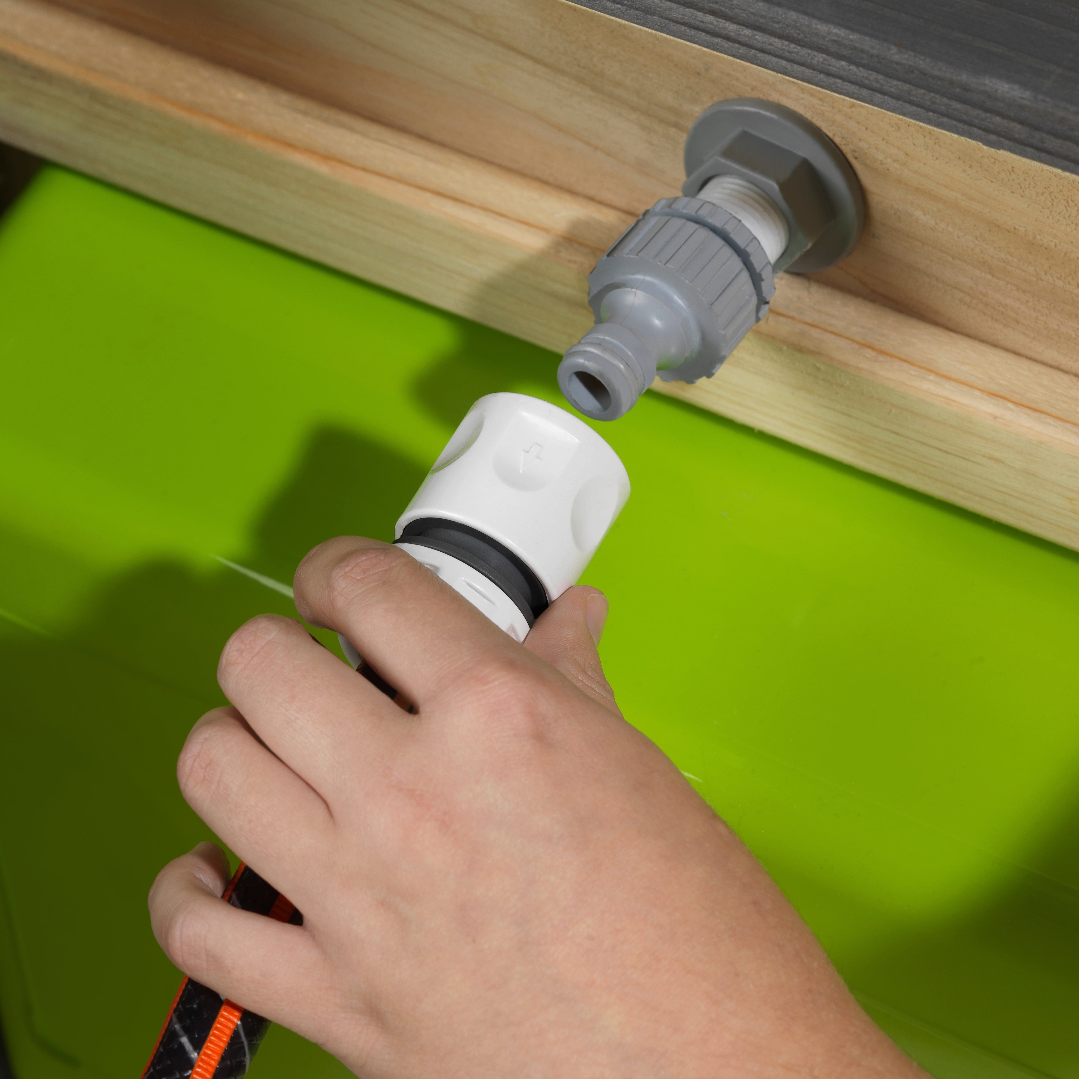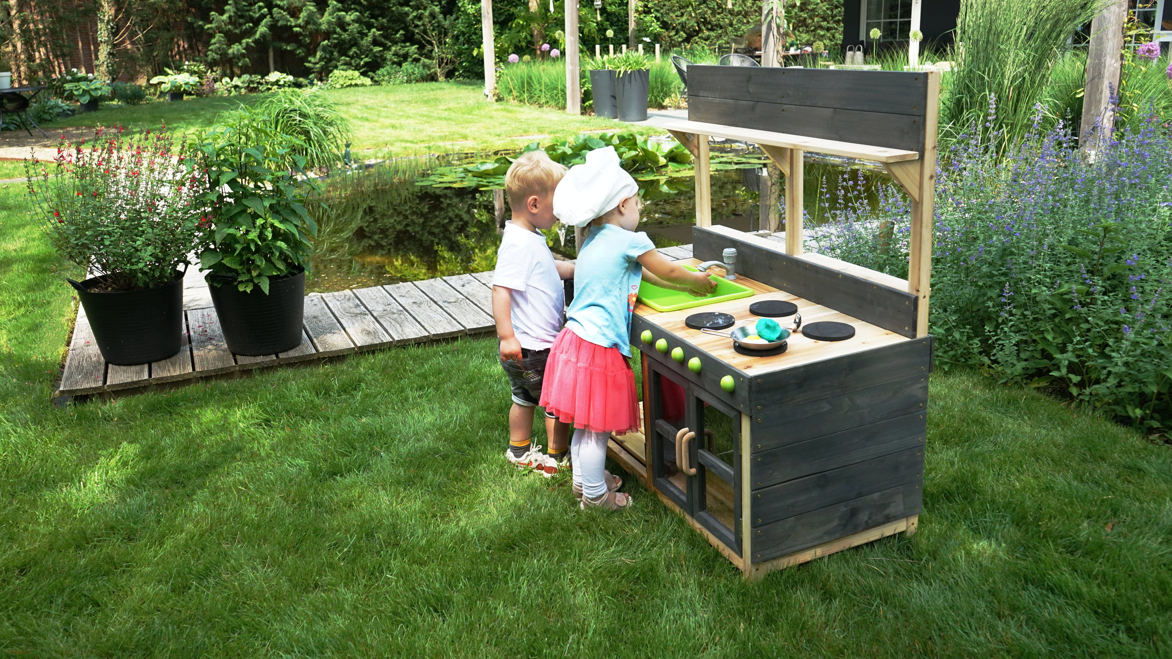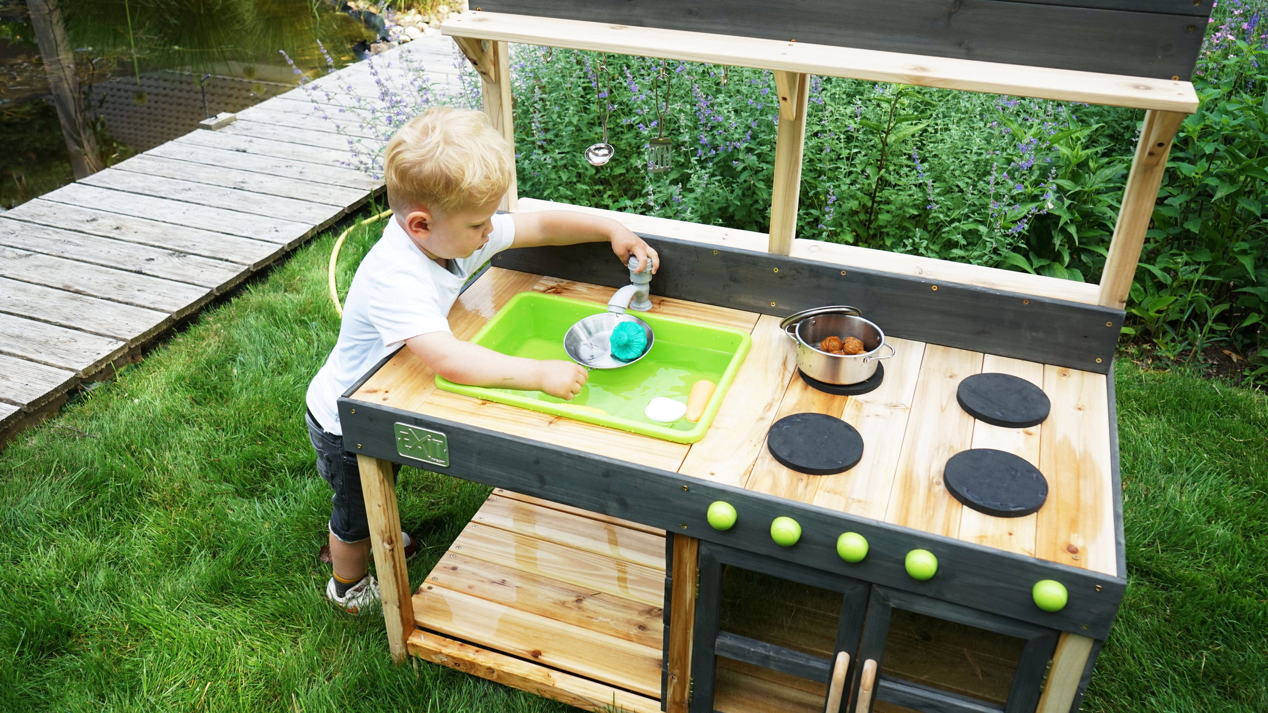 La cucina giocattolo colpisce per i suoi dettagli realistici: un fornello con manopole girevoli, un forno per fare splendide torte di sabbia e un rubinetto funzionante che può essere collegato a un tubo da giardino. Grazie al contenitore rimovibile, il "lavello" può essere svuotato rapidamente in seguito. Sono inclusi anche alcuni utensili da cucina che possono essere riposti sotto il lavandino e i fornelli oppure appesi ai ganci sopra il lavandino.