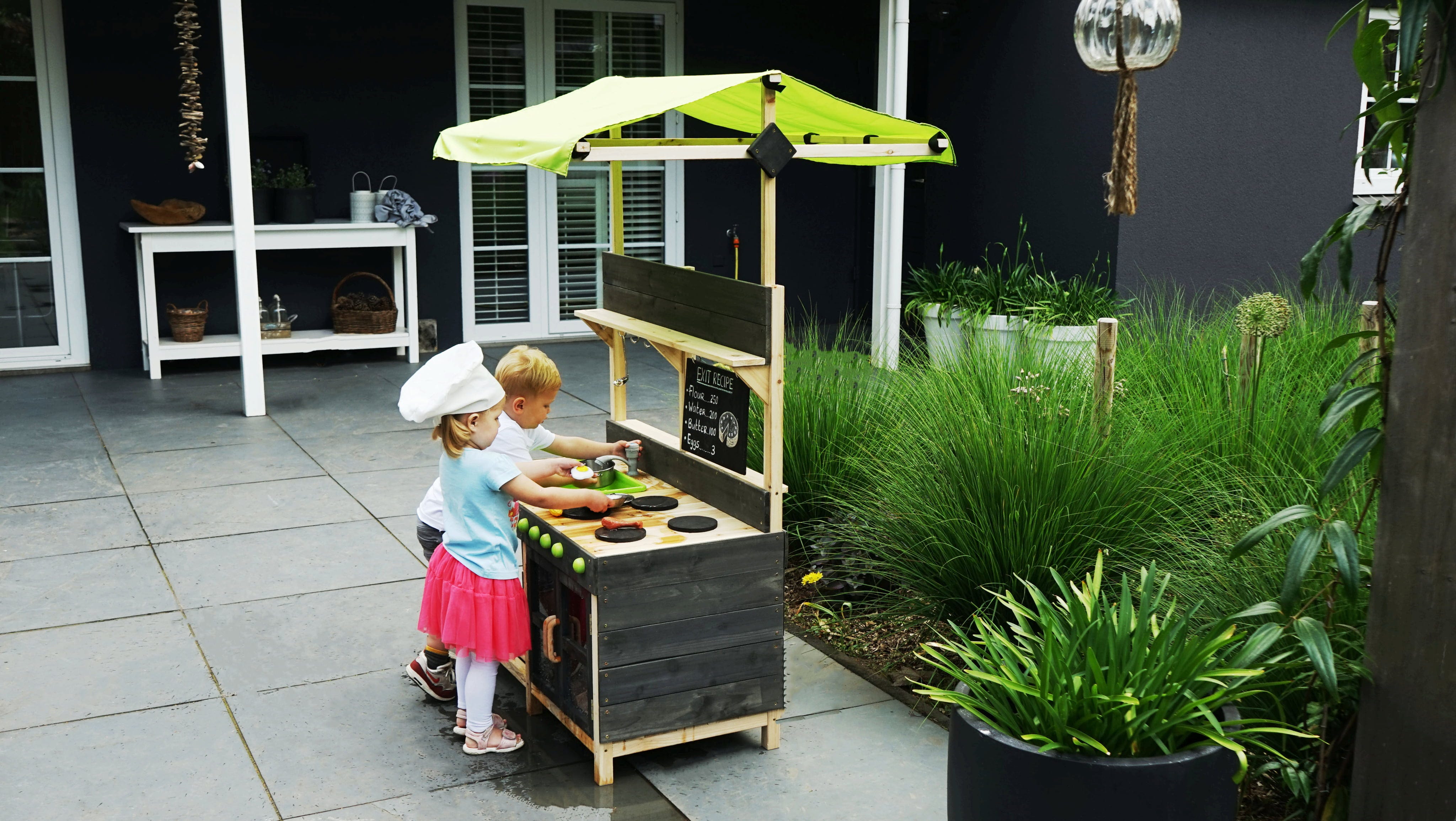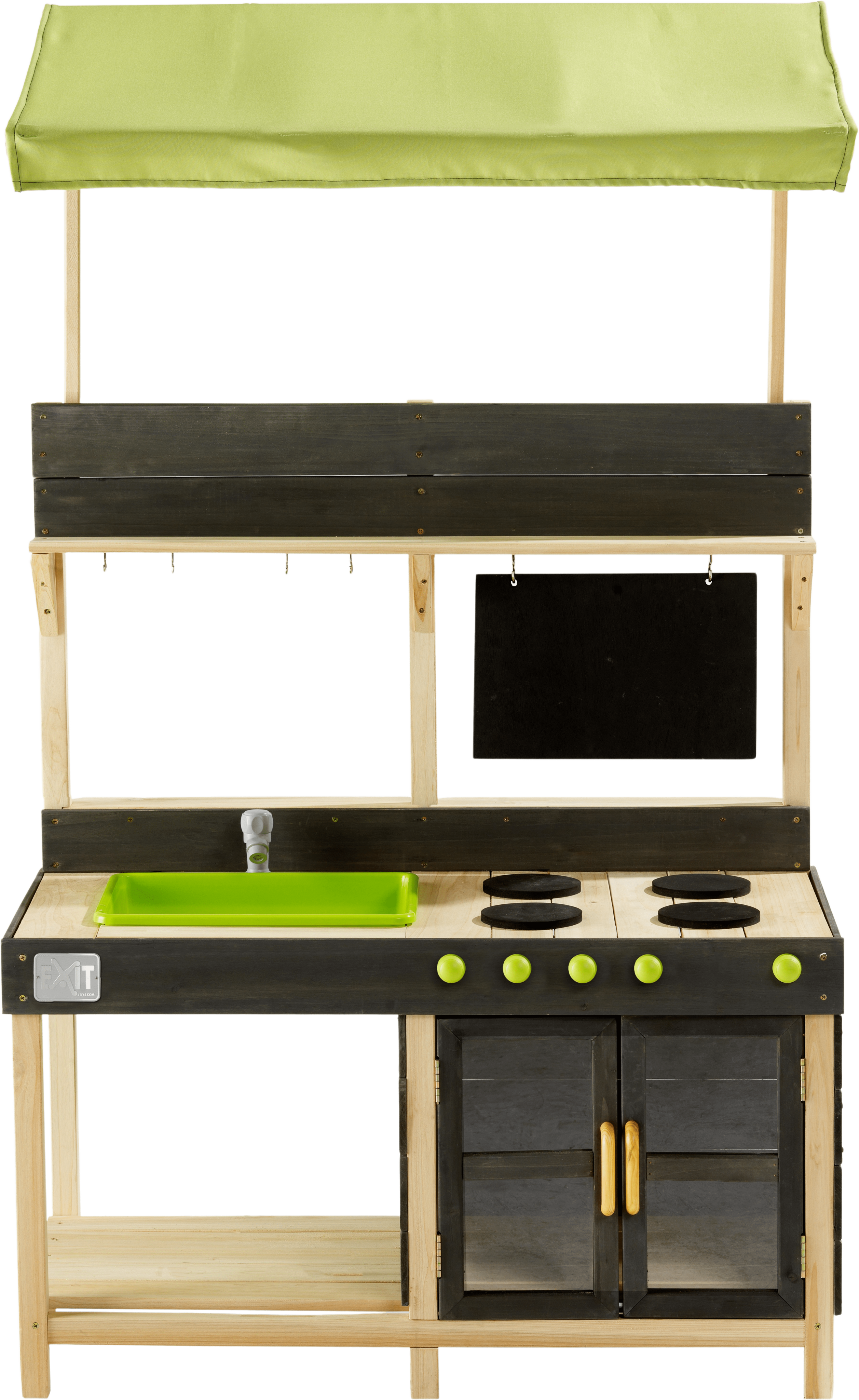 La cucina giocattolo colpisce per i suoi numerosi dettagli realistici: un fornello con manopole girevoli, un forno per preparare magnifiche torte di sabbia e naturalmente un rubinetto dell'acqua funzionante che può essere collegato a un tubo da giardino. Grazie al contenitore rimovibile, il "lavello" può essere svuotato rapidamente in seguito. La piccola lavagna e la tenda verde conferiscono alla cucina l'atmosfera di una bancarella del mercato, così i bambini possono anche vendere i piatti cucinati. Sono inclusi anche alcuni utensili da cucina che possono essere riposti sotto il lavandino e i fornelli oppure appesi ai ganci sopra il lavandino.