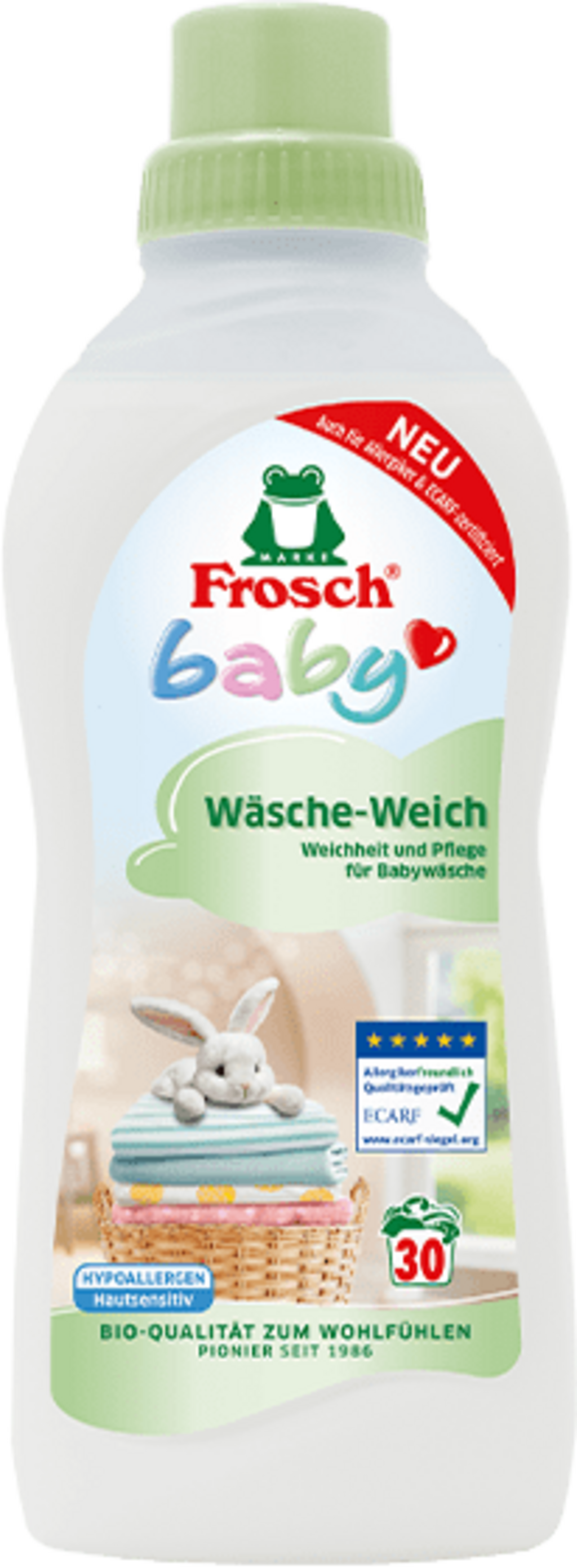 L'Ammorbidente - Baby di Frosch garantisce un bucato meravigliosamente morbido e coccoloso! Colpisce per la sua formulazione ipoallergenica, che non contiene ingredienti di origine animale né coloranti.