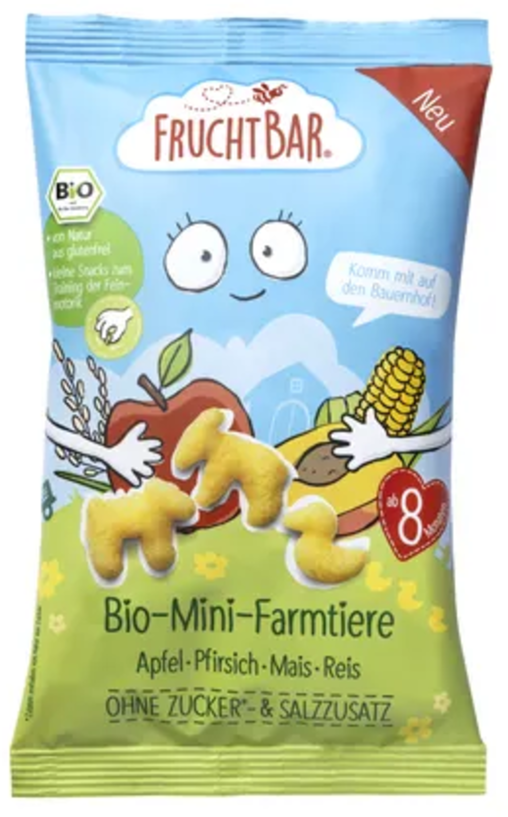 FruchtBar Mini Animali della Fattoria Bio - mela, Pesca, Mais e Riso, 20 g