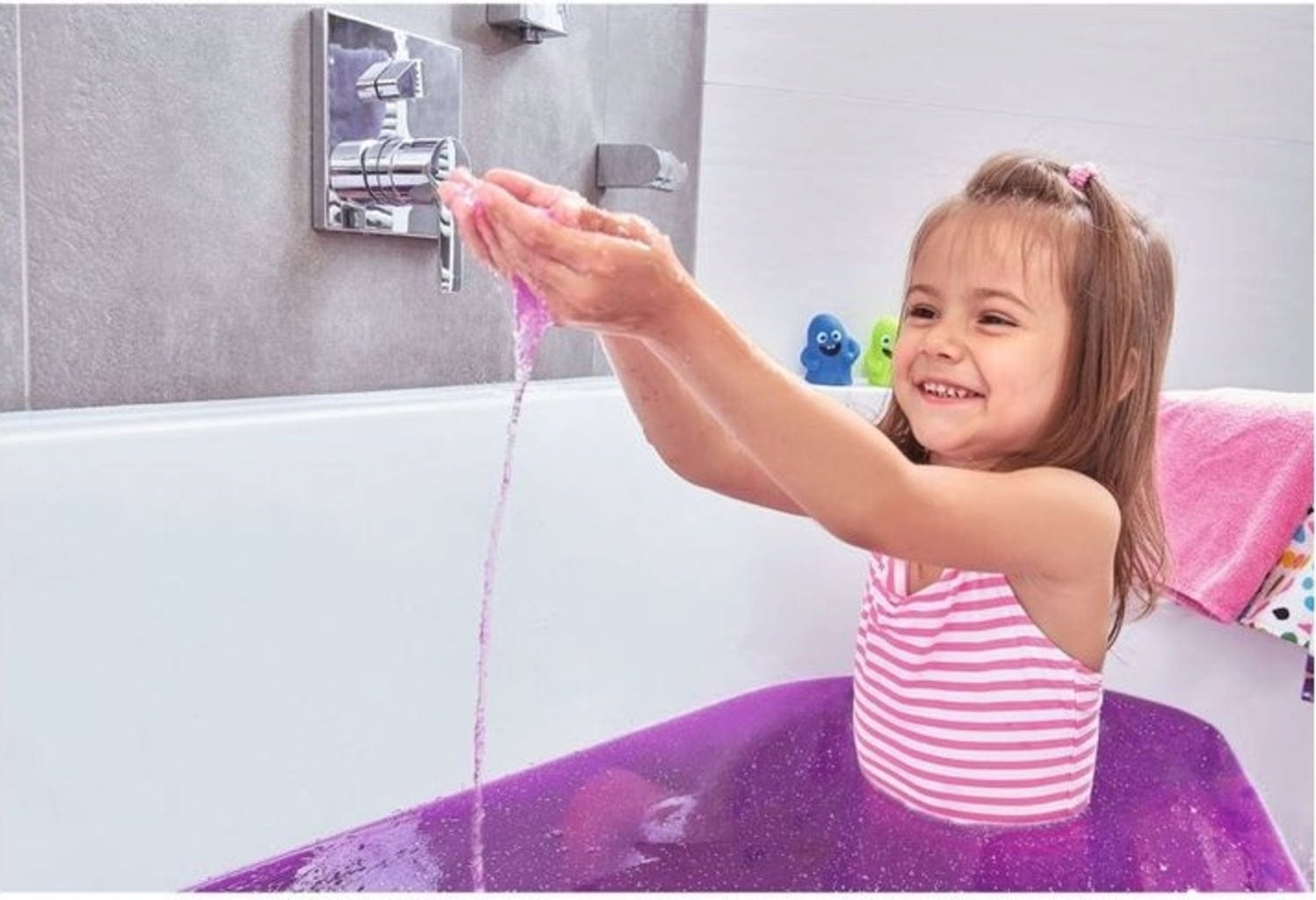 I bambini rimarranno stupiti! Una bustina di questo prodotto trasforma l'acqua nella vasca in uno slime viola glitterato, aumentando incommensurabilmente il fattore divertimento quando si fa il bagno. Lo slime è ovviamente dermatologicamente testato e biodegradabile. Quando il divertimento è finito, si diluisce con acqua a sufficienza e si lascia defluire.