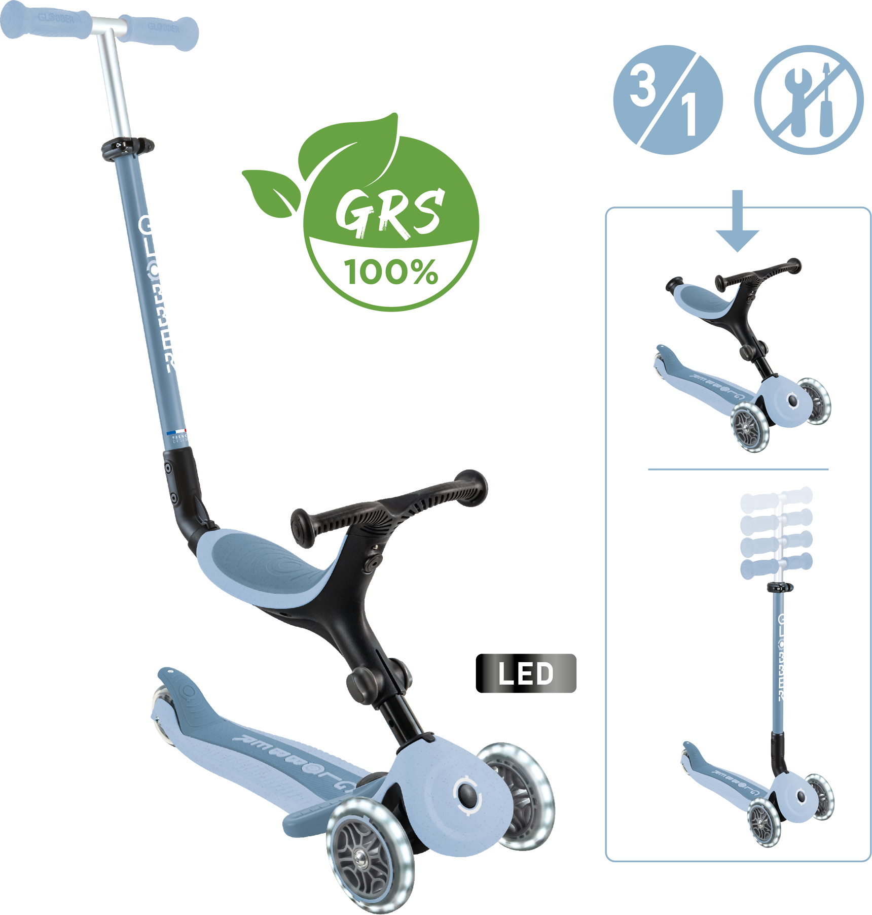 Il monopattino Go-Up Active Lights Eco coniuga ecosostenibilità e funzionalità. I ​​genitori possono contare su un modello 3 in 1 resistente, che si trasforma da monopattino con seduta a monopattino classico, ideale per molti anni a venire.