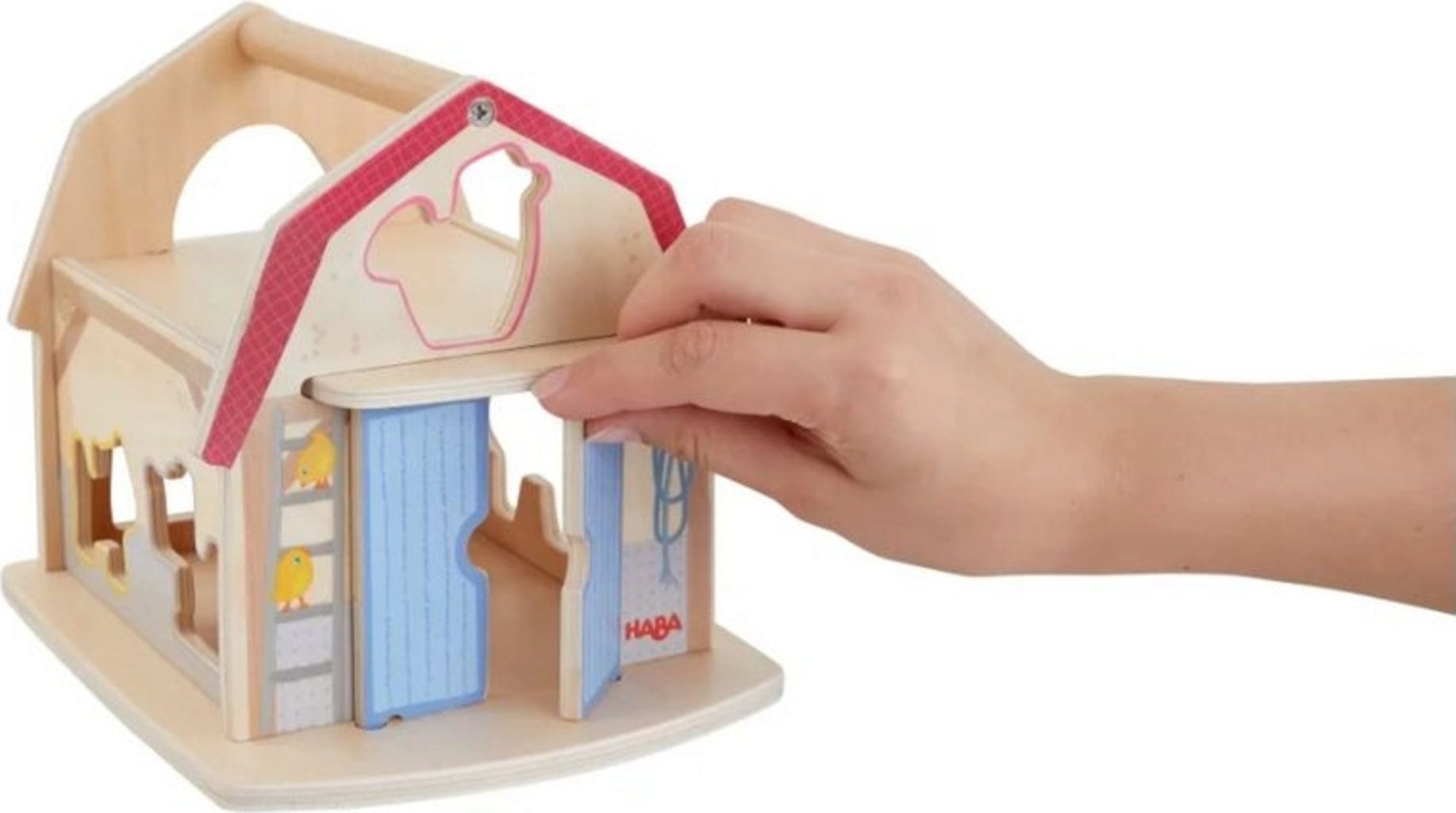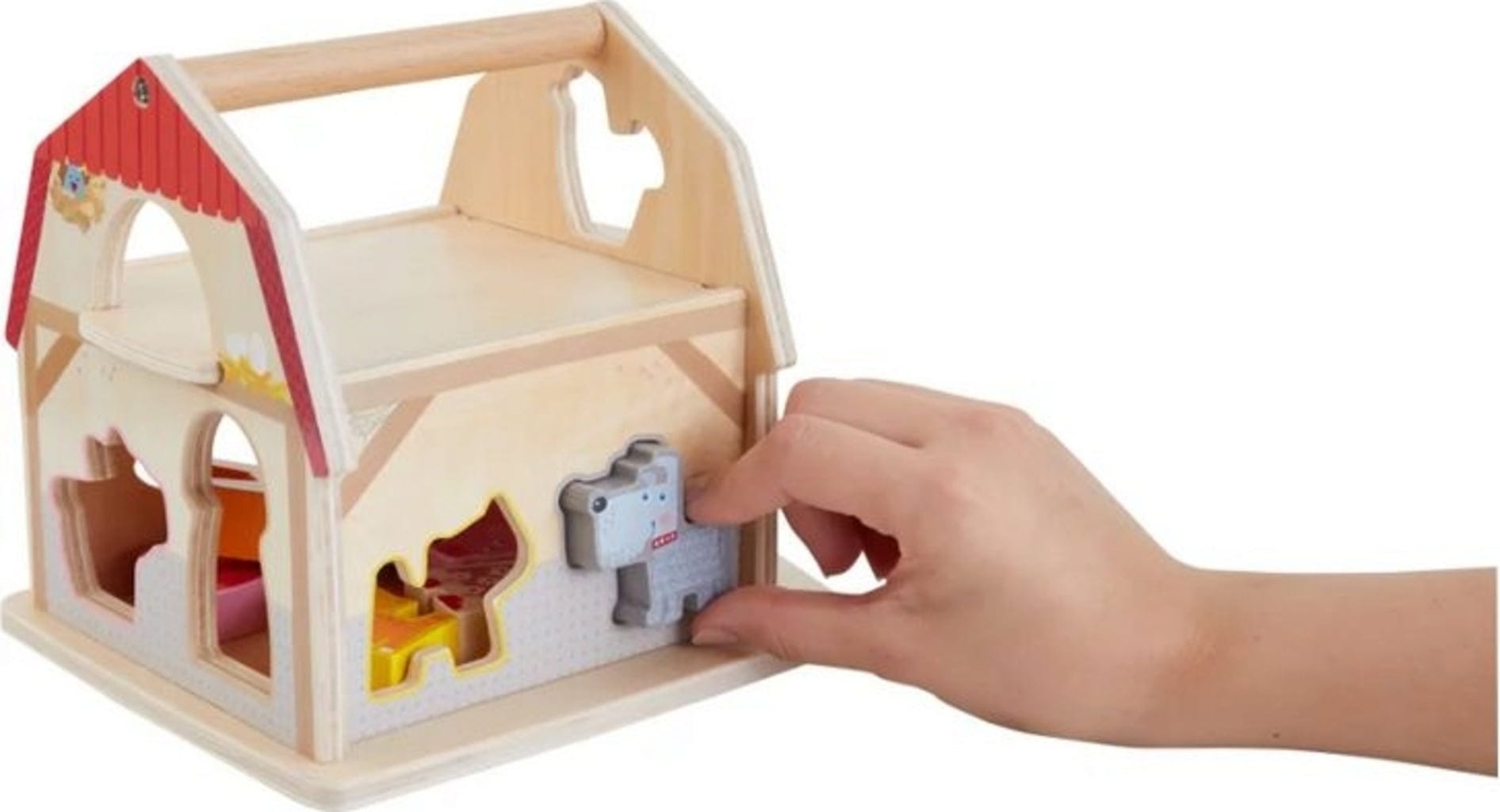 C'è molto da scoprire in questa fattoria. Chi riesce a trovare l'ingresso giusto per le sei simpatiche figure di legno? Gatto, cane e compagni hanno bisogno di aiuto per entrare, ma possono uscire poi attraverso la porta apribile del fienile.