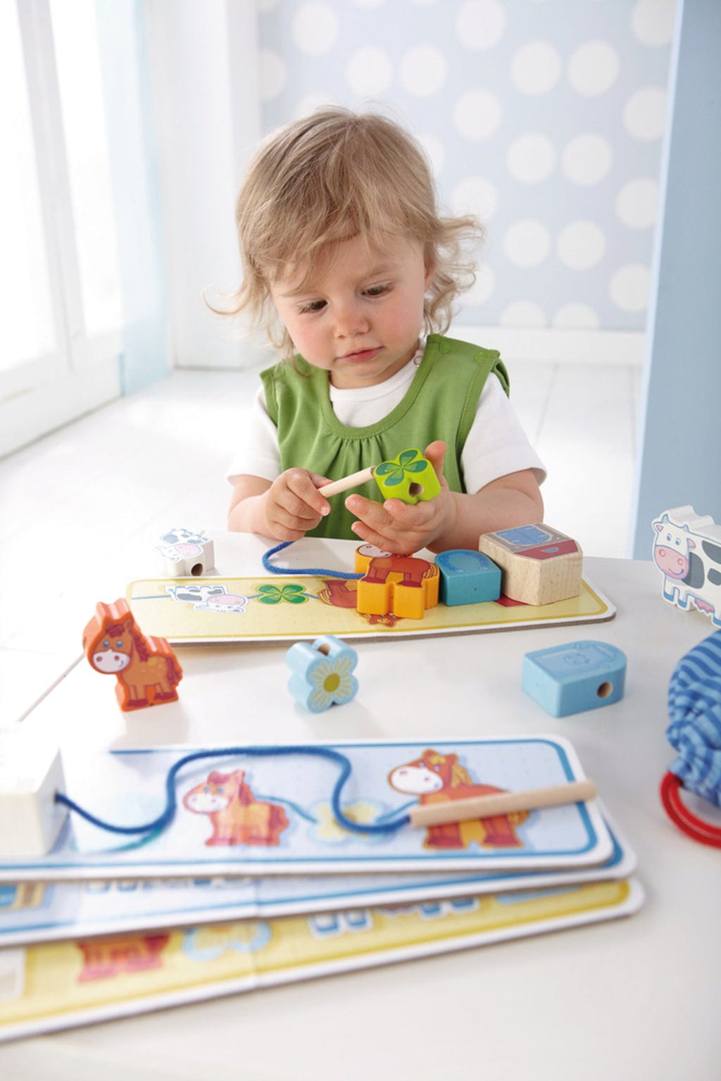 Quale animale preferisce mangiare il trifoglio? Dove vive il vitello? E quale animale ha bisogno di nuovi ferri di cavallo? Questo divertente gioco promette esperienze emozionanti per i più piccoli. Le simpatiche figure in legno possono essere infilate sulle corde secondo seguendo l'immaginazione o i modelli. Le istruzioni contengono anche tre suggerimenti divertenti per vari giochi con gli amici che allenano l'immaginazione e il tatto in modo divertente.