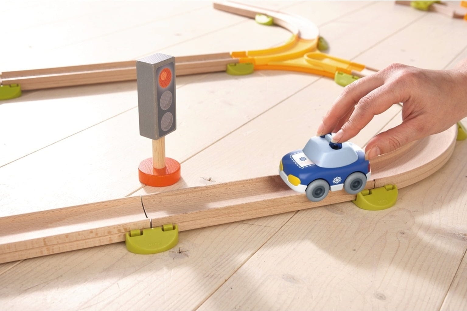 Nell'allegro mondo di Kullerbü questa fantastica macchina della polizia garantisce la legge e l'ordine. È facile da guidare con il motore a slancio, basterà quindi solo spingerla per sfrecciare sulla pista per biglie.
