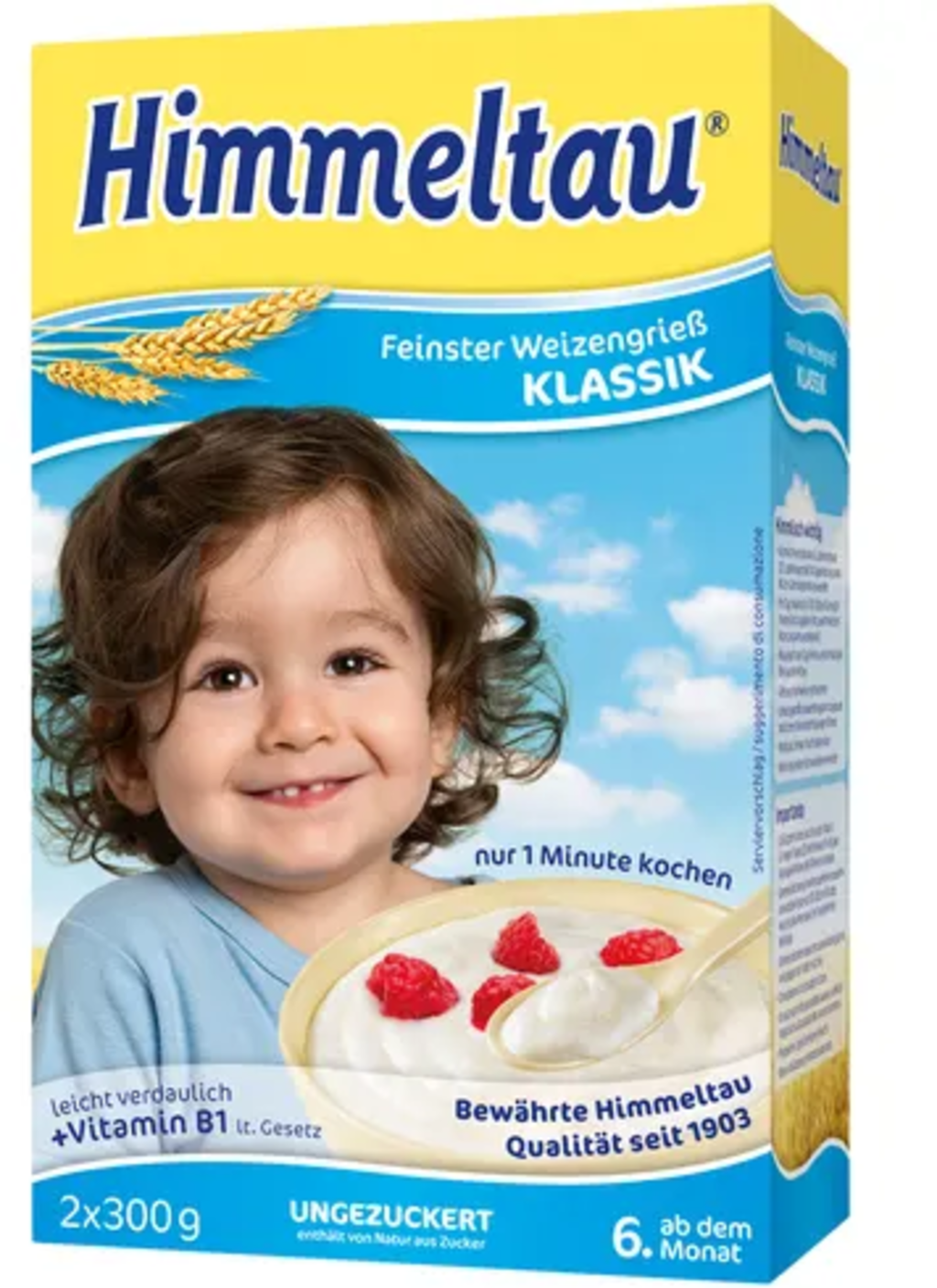 Il semolino classico di Himmeltau è adatto per i bambini a partire dai 6 mesi e per la preparazione di un'ampia varietà di piatti a base di semolino. La ricetta contiene vitamina B1 ed è priva di zuccheri aggiunti. Il semolino classico di Himmeltau, inoltre, si può preparare anche come bevanda per il biberon.