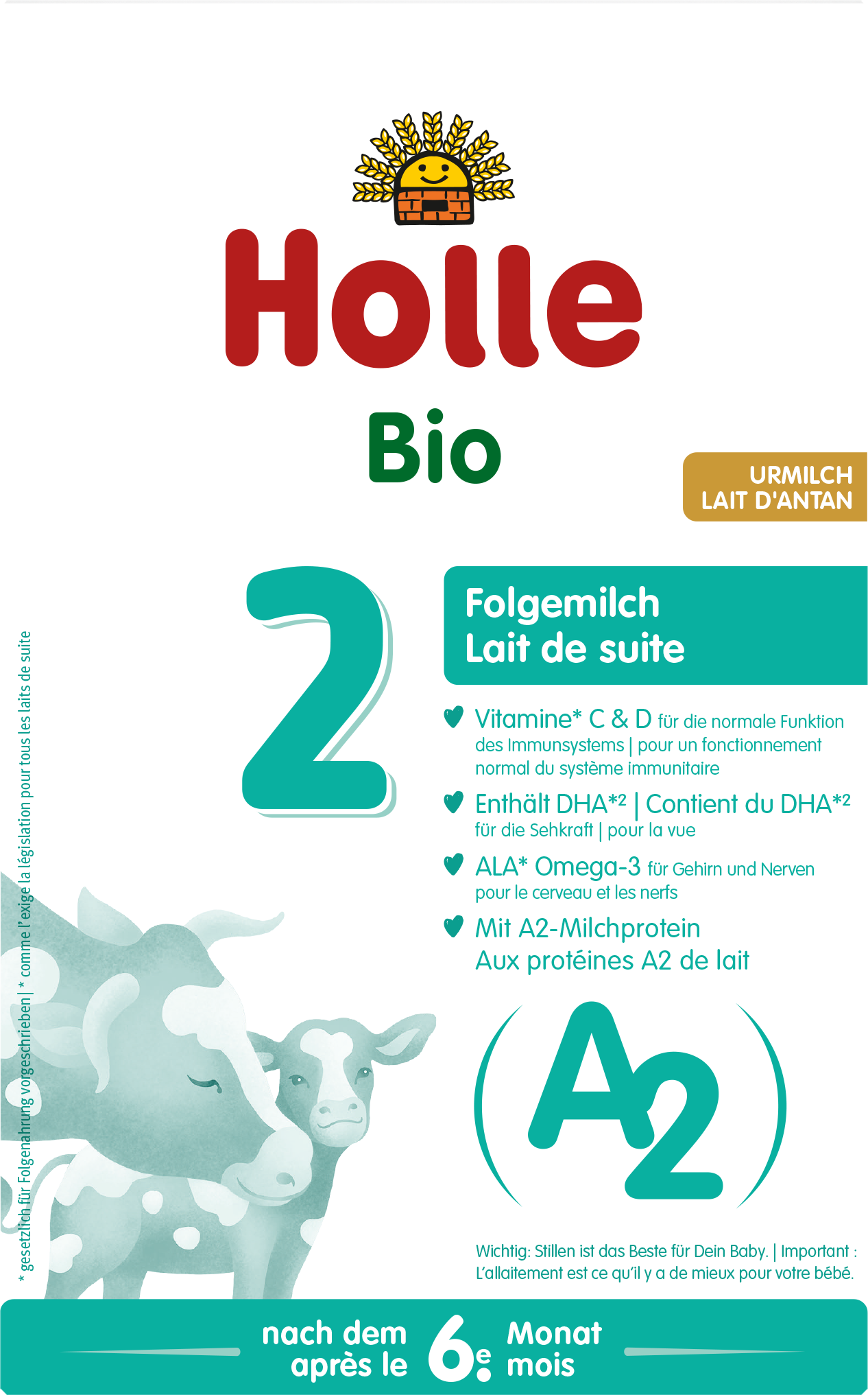 La formula di proseguimento 2 A2 Bio di Holle può essere utilizzata dopo l'allattamento al seno e non prima che il bambino abbia compiuto 6 mesi, anche nell'ambito di un'alimentazione mista. Si può anche utilizzare per la preparazione delle pappe ai cereali di Holle. La formula contiene una miscela bilanciata di proteine del siero di latte e caseina, acidi grassi ALA omega-3, DHA e ARA.