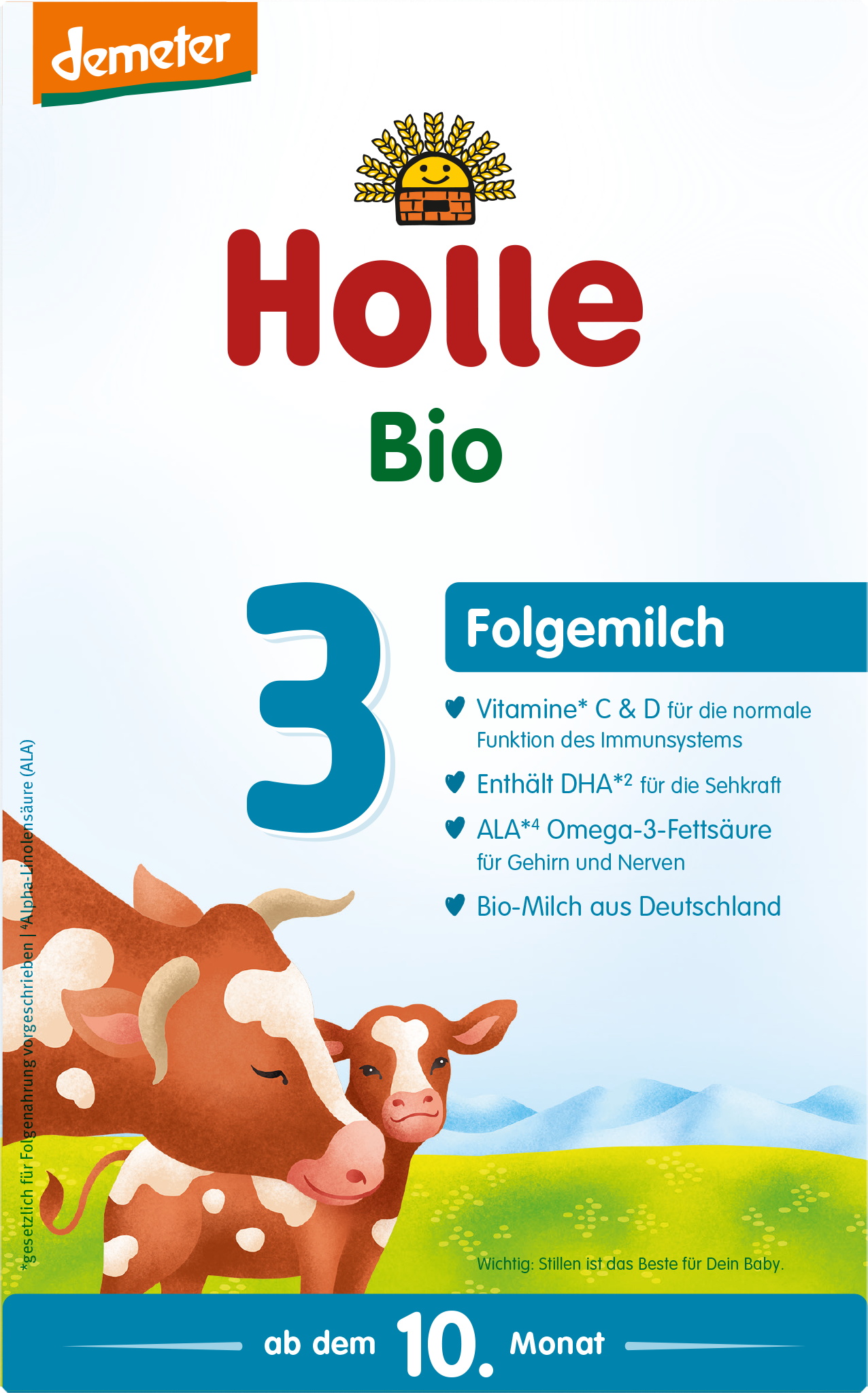 La formula di proseguimento 3 viene prodotta con latte vaccino proveniente dalla Germania meridionale e certificato Demeter. Tutti gli ingredienti sono rigorosamente controllati e garantiscono la massima sicurezza possibile. Si può somministrare dal 10° mese sino alla fine del 3° anno come parte di un’alimentazione mista che comprende il biberon e le pappe.