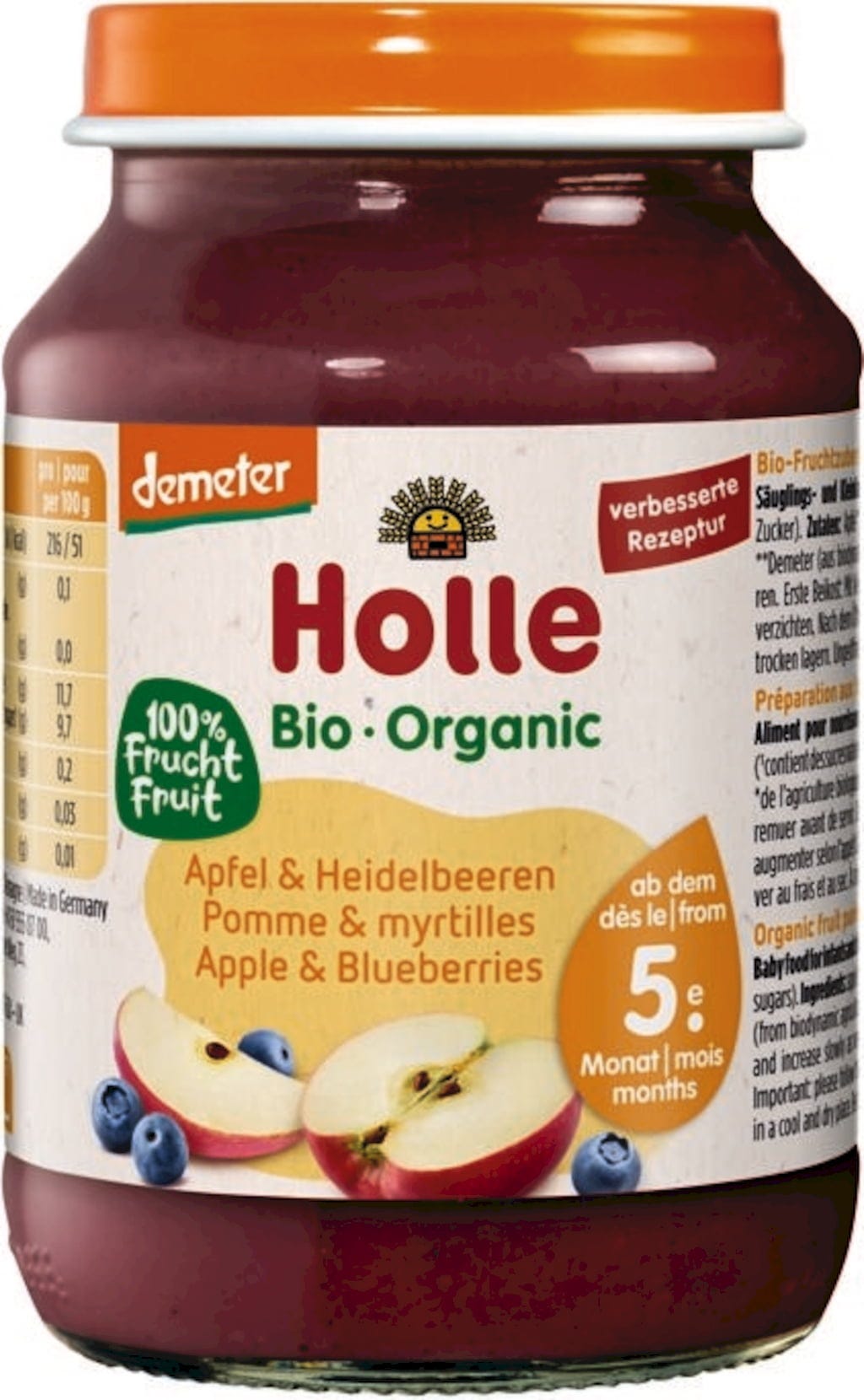 Questa preparazione in vasetto contiene mele e mirtilli della migliore qualità biologica, alcuni dei quali sono certificati Demeter. La preparazione alla frutta è naturalmente dolce ed è adatta ai bambini a partire dal 5° mese, come fine pasto o come merenda. La consistenza è particolarmente cremosa. Il prodotto si può offrire al bambino puro oppure aggiungerlo alle pappe latte o al porridge a base di cereali. La ricetta non contiene zuccheri o sale aggiunti, è priva di glutine e lattosio ed è ovviamente vegan.