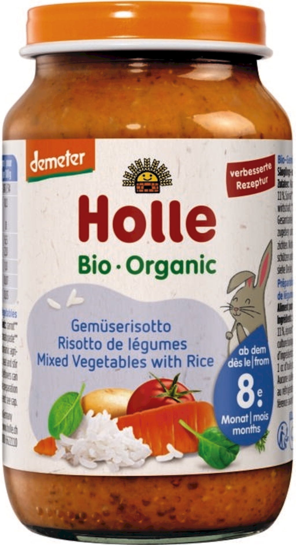 Questo delizioso risotto alle verdure bio può essere gustato dai bambini a partire dall'8° mese. La preparazione cremosa ha dei piccoli pezzetti che stimolano la masticazione. La ricetta non contiene sali aggiunti e tutti gli ingredienti sono accuratamente selezionati e provengono da coltivazioni biologiche rigorosamente controllate, alcuni in qualità Demeter. Perché il menu risulti più gradito al bambino è meglio riscaldare il vasetto a bagnomaria a circa 37 °C.