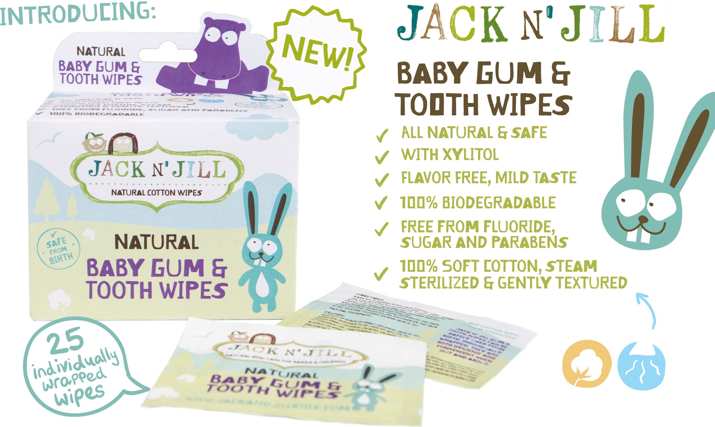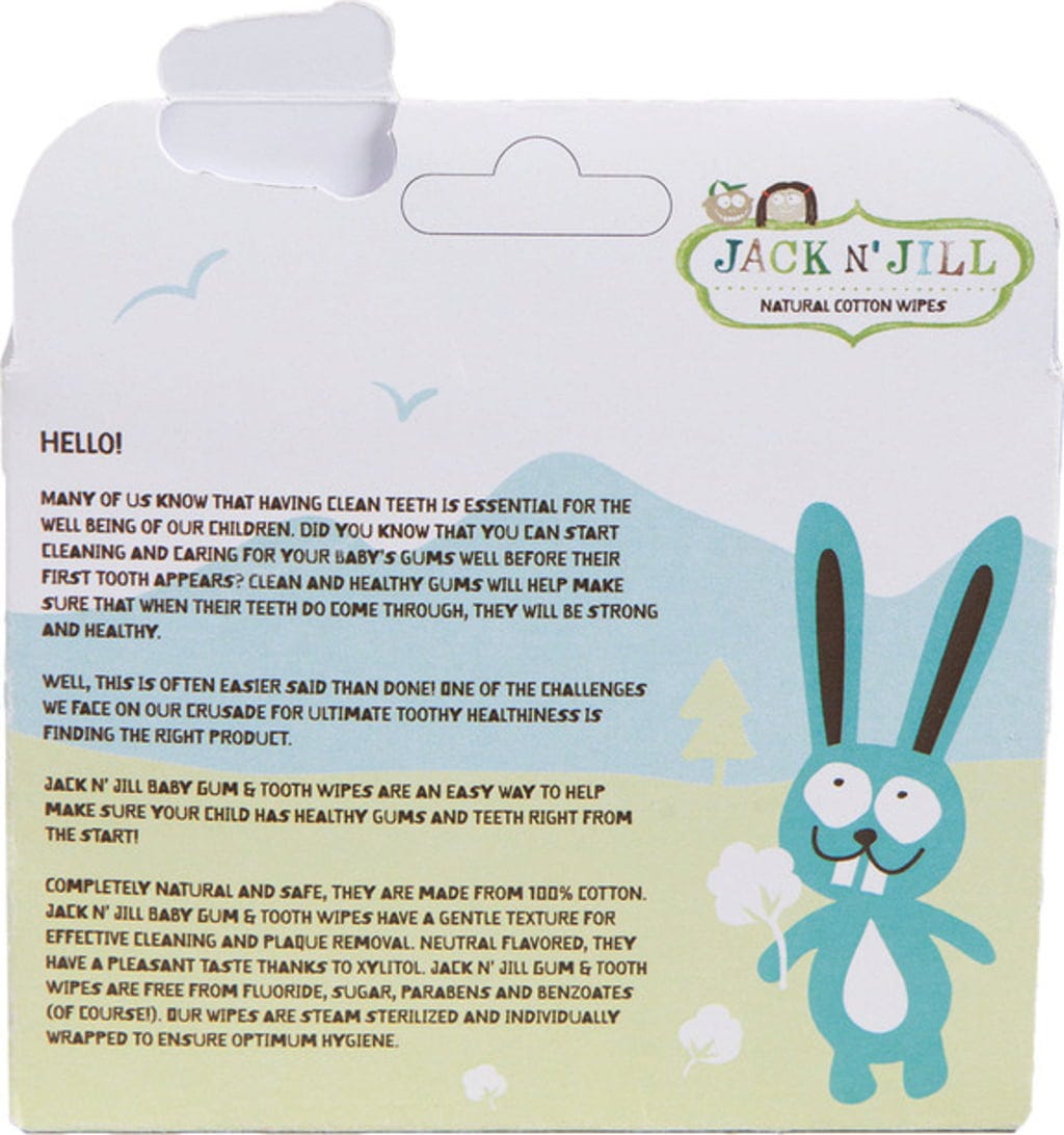 La pulizia dei denti è fondamentale, si sa, e questo vale ovviamente anche per i bambini. Una corretta igiene orale è importante ancora prima che spuntino i primi dentini, perché le gengive costituiscono la base per la crescita dei denti. I panni per la pulizia di gengive e dentini di Jack 'N Jill sono delicati e naturali al 100% e adatti ad una corretta igiene della bocca dei più piccoli. I panni si possono utilizzare quotidianamente.