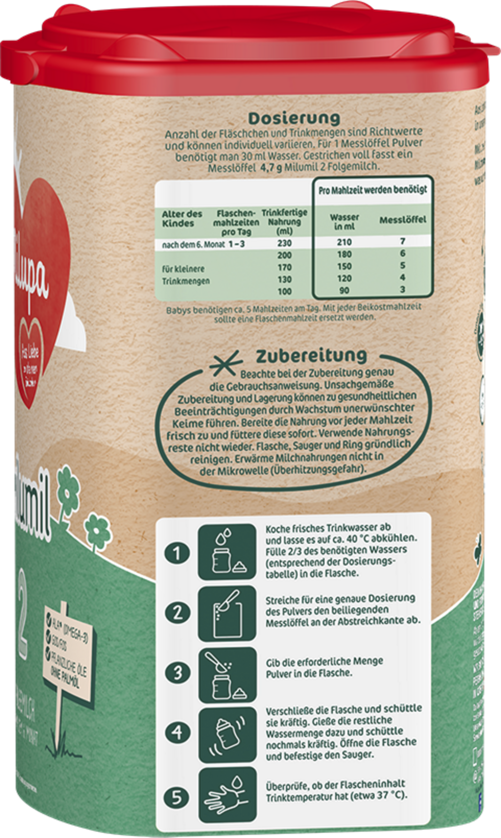 Preparazione: per una corretta preparazione si prega di osservare le istruzioni contenute nell'apposita sezione situata sotto le tabelle dei valori nutrizionali. Leggere anche la sezione con le informazioni importanti sull'uso del latte formulato.