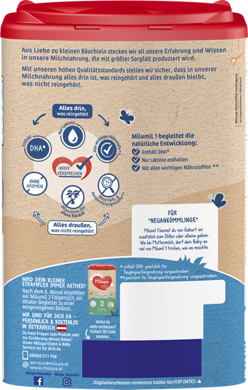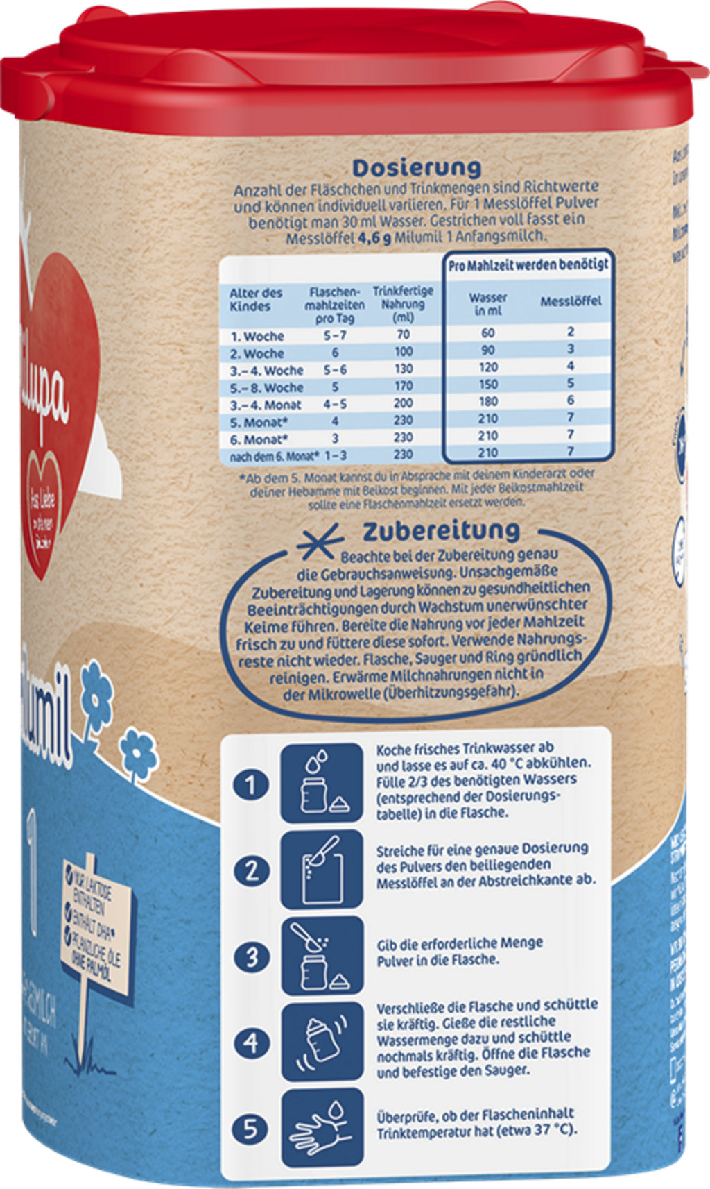 Secondo la raccomandazione generale, per i primi sei mesi di vita i bambini dovrebbero essere allattati esclusivamente al seno. Tuttavia, in alcuni casi è necessario interrompere l'allattamento al seno o integrare il latte materno con una formula per lattanti. In questi casi, la formula per lattanti 1 Milumil è una valida alternativa o aggiunta al latte materno, e può essere somministrata dalla nascita fino allo svezzamento, o sostituita con una formula di proseguimento dopo il sesto mese di vita.