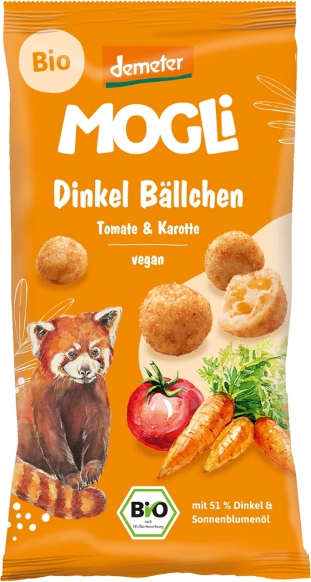 Uno snack vegano a base di farina di farro, le palline di farro sono cotte in olio di semi di girasole e aromatizzate con varie spezie, oltre che a pomodoro e carota. Prive di grasso di palma e senza l'aggiunta di aromi, le palline di farro di Mogli sono perfette sia per i bambini che per gli adulti.
