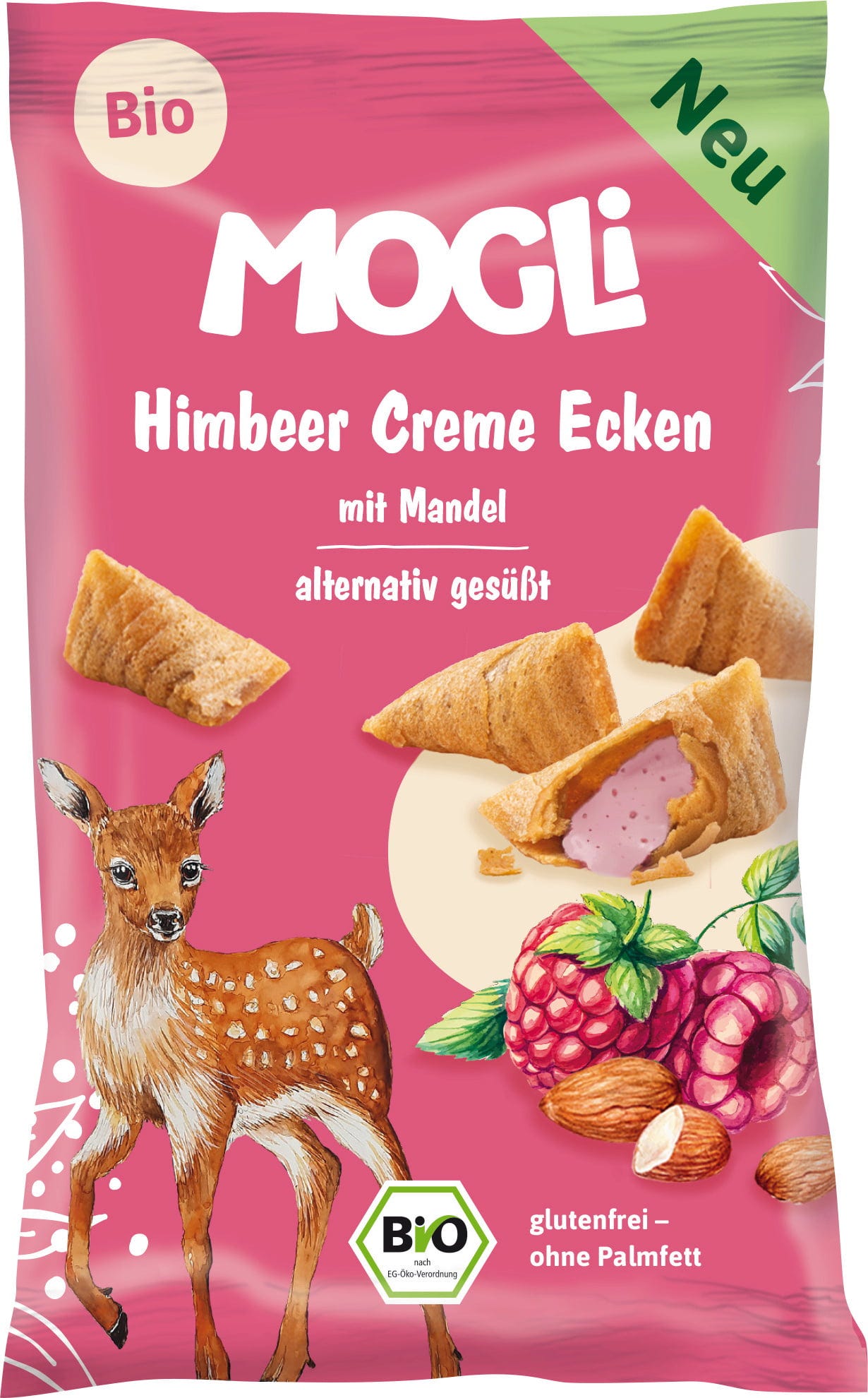 Croccanti triangolini a base di farina di riso e di ceci ripieni con una crema fruttata di lamponi e mousse di mandorle. La dolcezza deriva dalla frutta e dall'agave. Una delizia vegana e priva di olio di palma, perfetta per uno snack sfizioso durante la giornata. Il prodotto è inoltre privo di glutine.