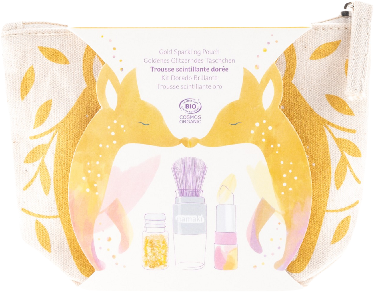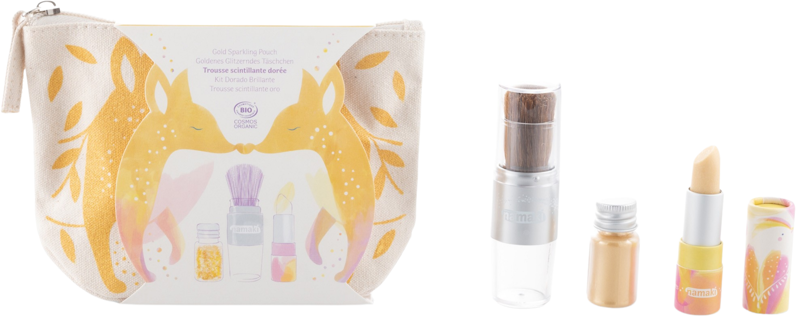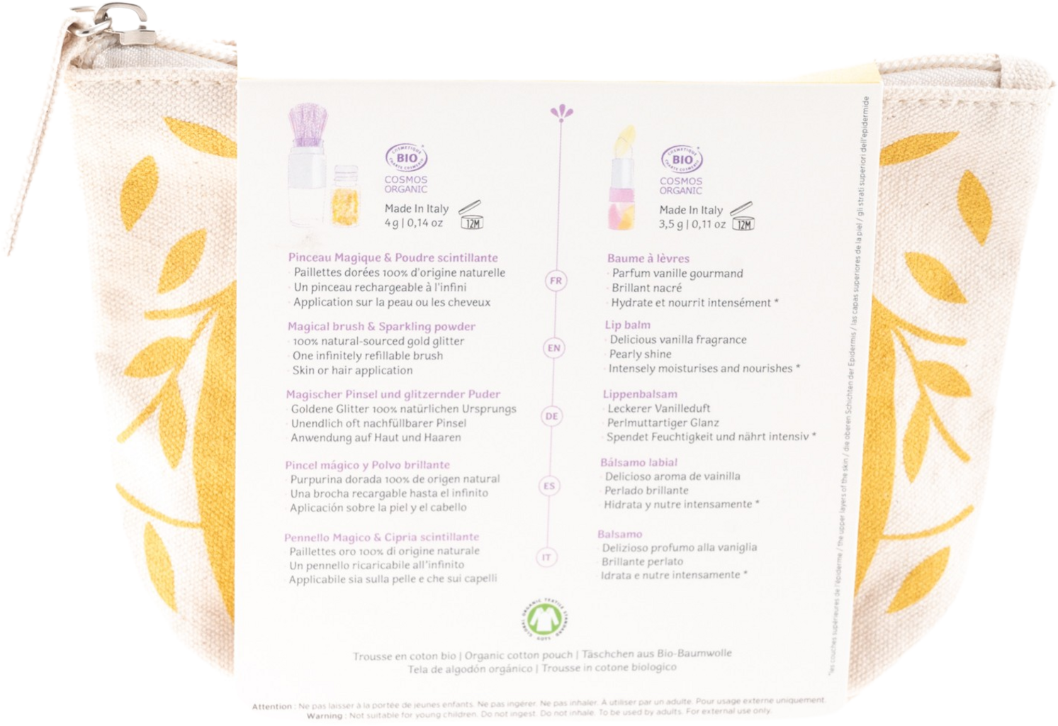 In questa graziosa trousse stampata troverete un balsamo per labbra alla vaniglia e una polvere dorata scintillante da inserire in un pennello ricaricabile. Entrambi i prodotti sono ipoallergenici e sicuri per il trucco dei bambini.