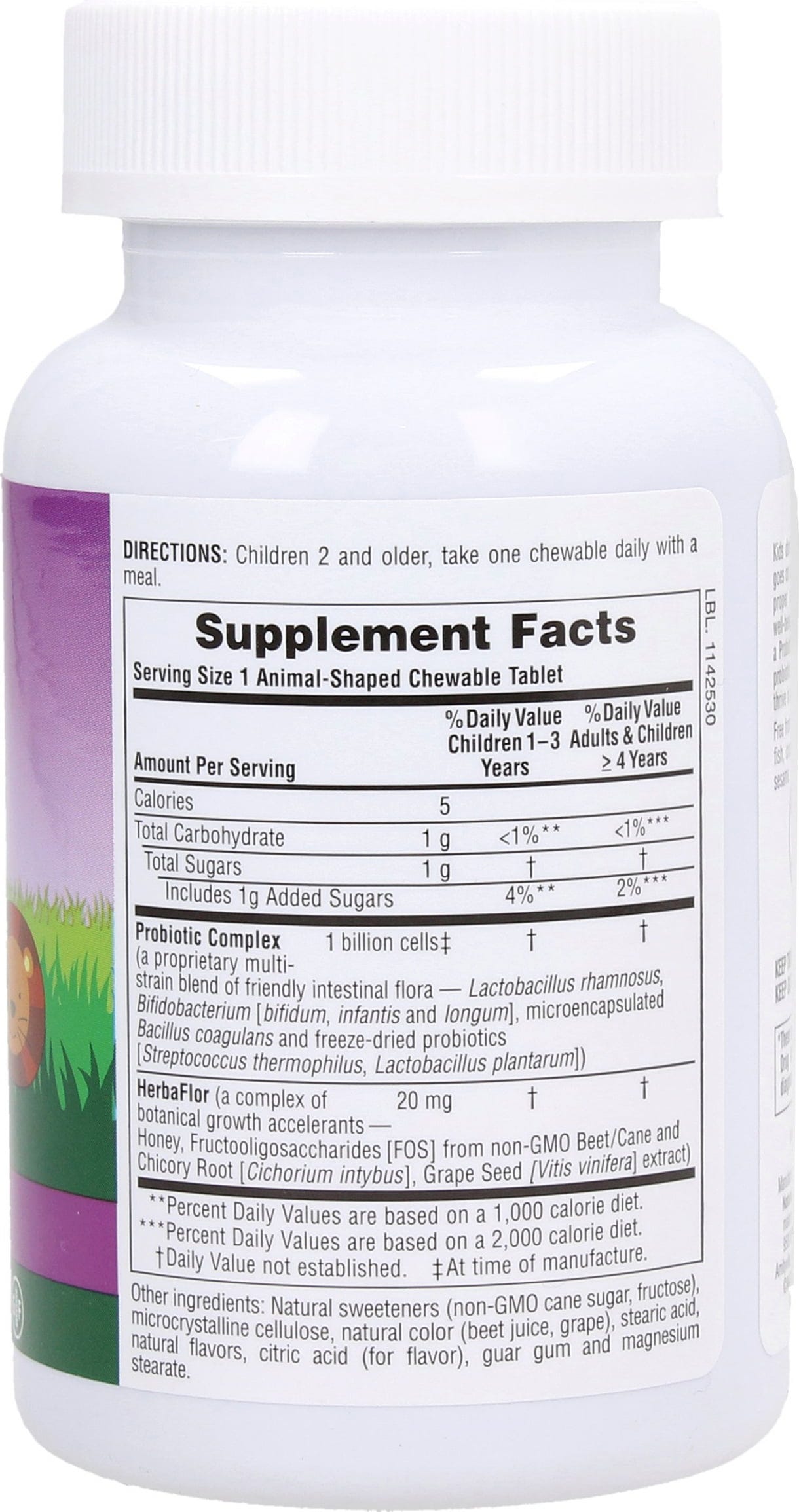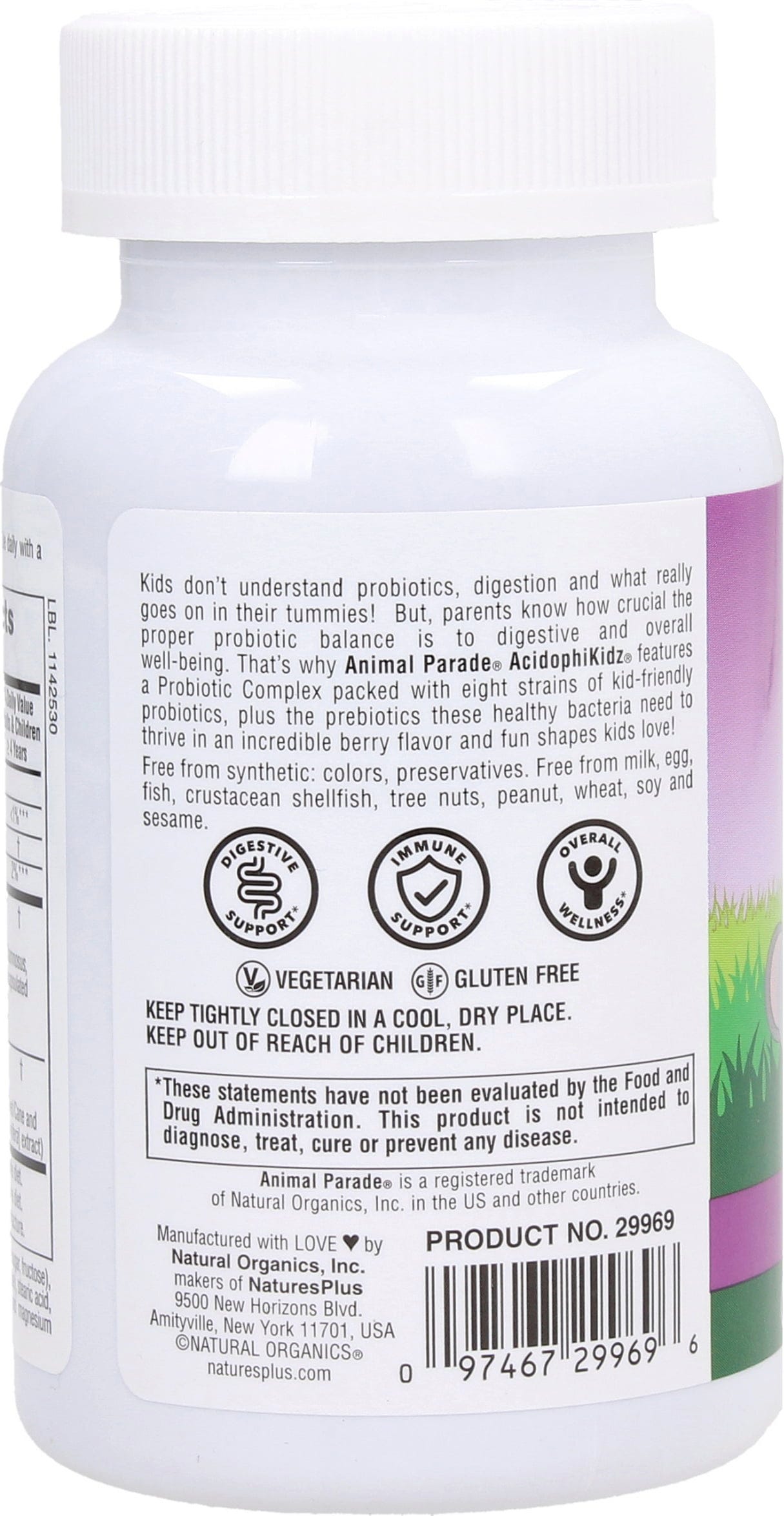 Ogni compressa di Animal Parade AcidophiKiDZ fornisce circa 1 miliardo di batteri intestinali probiotici.
