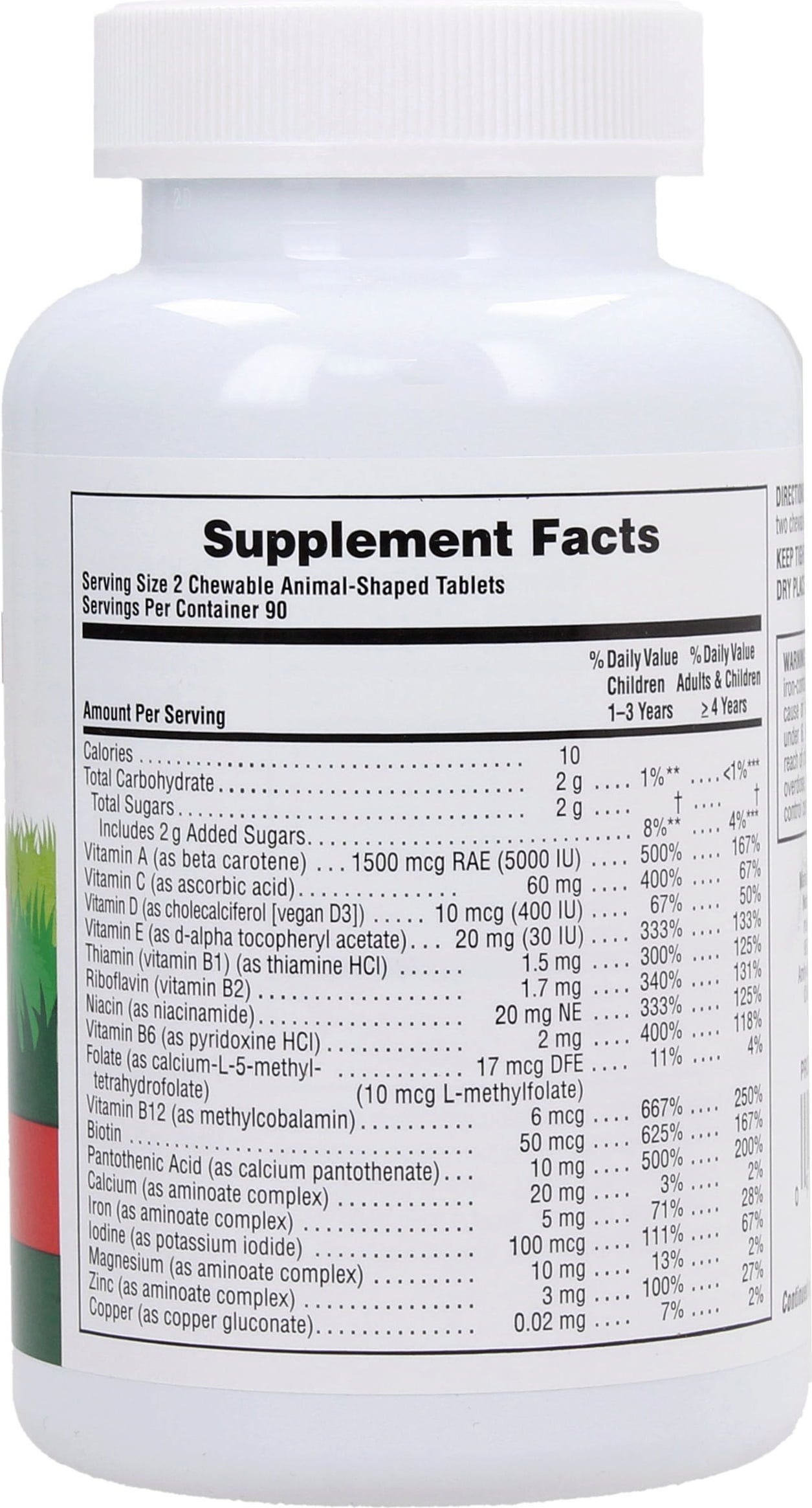 Questo integratore alimentare combina una base di 15 vitamine e 8 minerali con concentrati attivi dall'alga spirulina, estratti di carote, broccoli e spinaci e molto altro. In totale sono stati lavorati 4 tipi di verdure, 8 tipi di frutta e altre sostanze vitali ottenute dai cinorrodi e dall'olio di girasole. Le compresse masticabili sono a forma di animaletti... perfette per i più piccini!