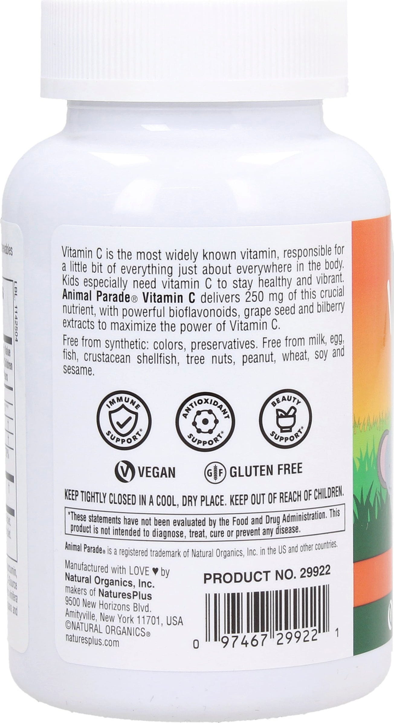 Ogni compressa masticabile di questo integratore alimentare offre 125 mg di vitamina C insieme a 25 mg di bioflavonoidi degli agrumi, estratti di semi d'uva e di mirtilli, oltre che concentrati di mango e di papaia. Le compresse, adatte per i bambini dai 2 anni, sono a forma di animali e hanno uno squisito sapore di arancia.