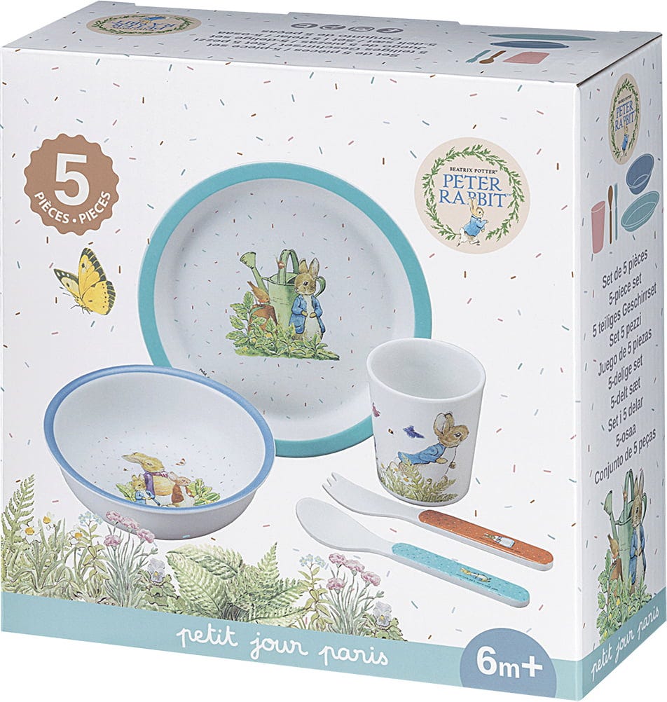 Il pasto è servito! Peter Hase osserva curioso mentre i piccoli buongustai si saziano a colazione, pranzo e cena. Non c'è da stupirsi, perché con questo set di stoviglie dal design accattivante, il buon umore è assicurato.