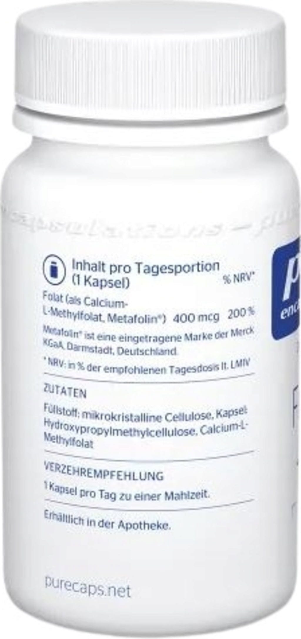 La particolarità di questo integratore alimentare è che contiene Metafolin, un legame di calcio della forma bioattiva naturale dell'acido folico (5-MTHF). Folato 400 di Pure Encapsulations® contiene 400 mcg di acido folico (come calcio-L-metilfolato, Metafolin®) per capsula.