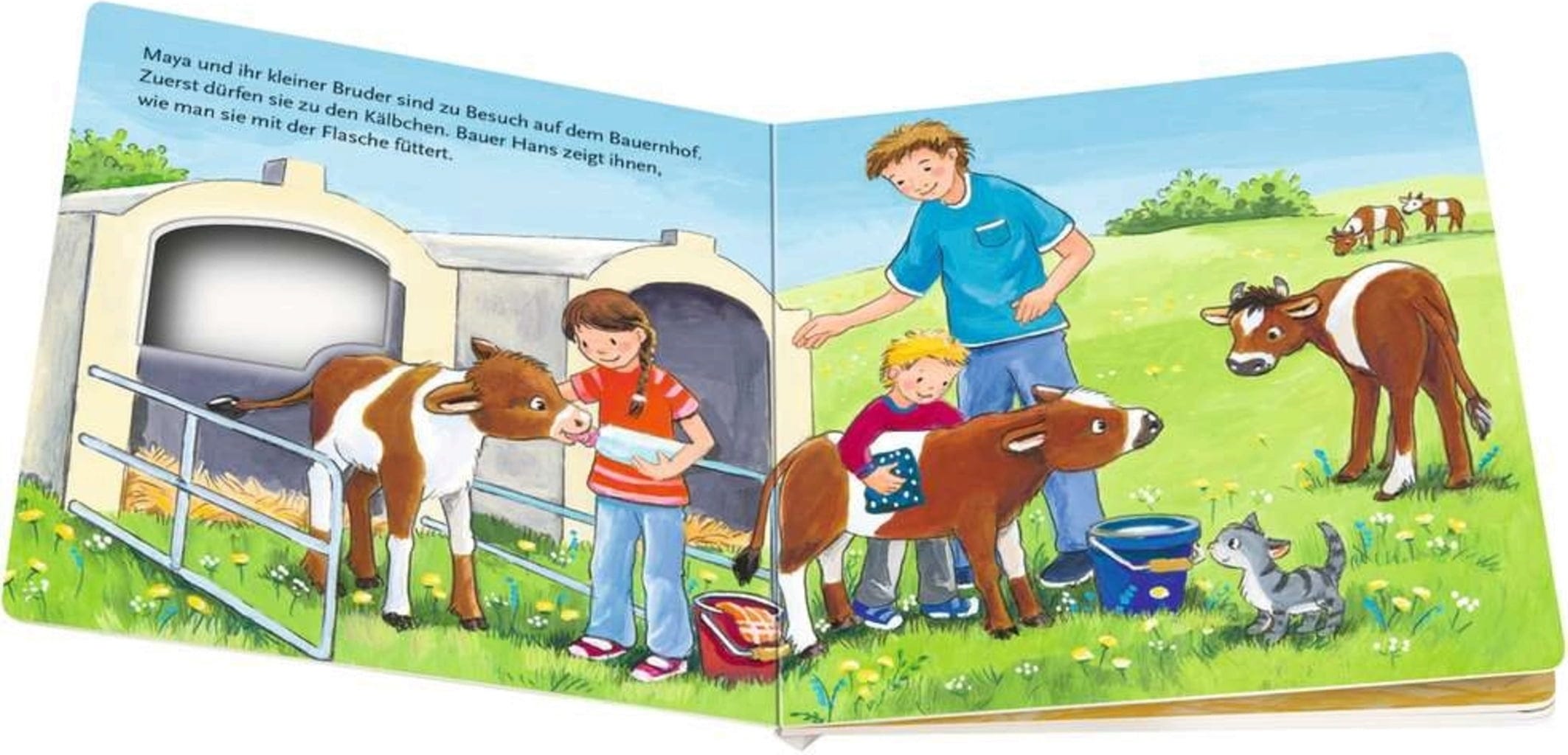 Con questo libro illustrato progettato con cura, i piccoli esploratori possono seguire Maya e il suo fratellino alla fattoria. Insieme danno da mangiare al vitello appena nato, tosano la lana delle pecore e osservano il trattore al lavoro. Gli spioncini divertenti forniscono intrattenimento