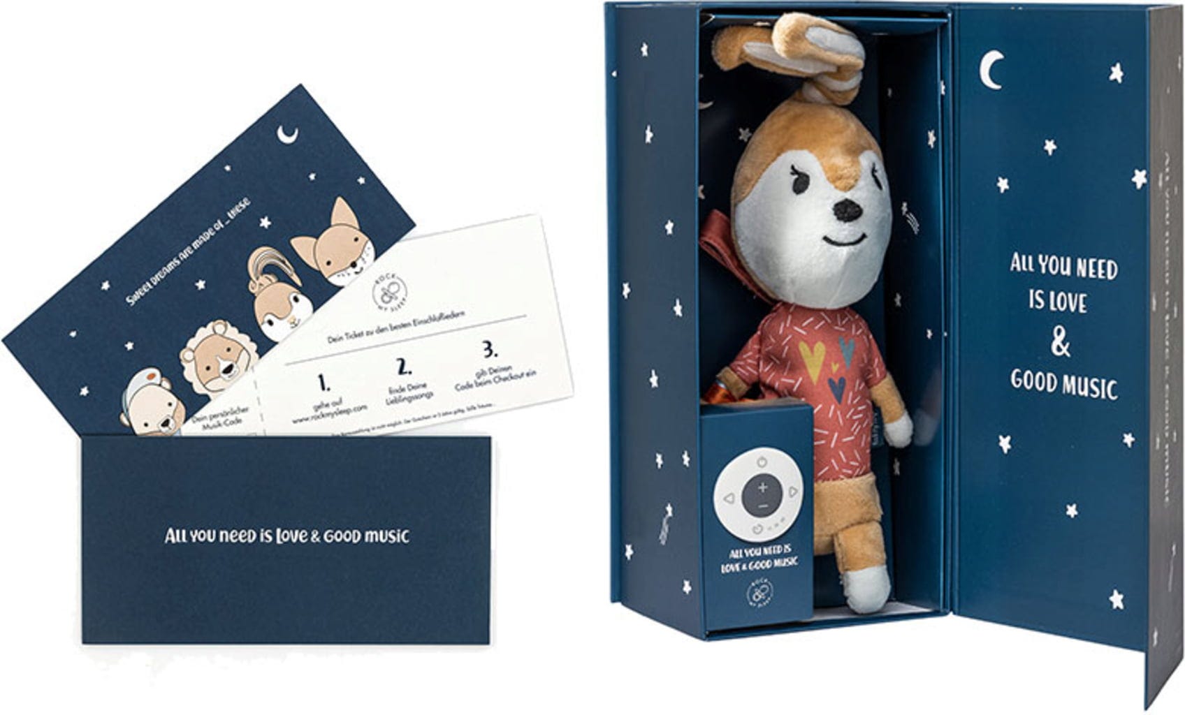 Contenuto del set regalo: peluche con lettore musicale, cavo dati USB-A, confezione regalo decorativa, biglietto di auguri da compilare, 3 batterie AAA, buono per una ninna nanna, istruzioni.