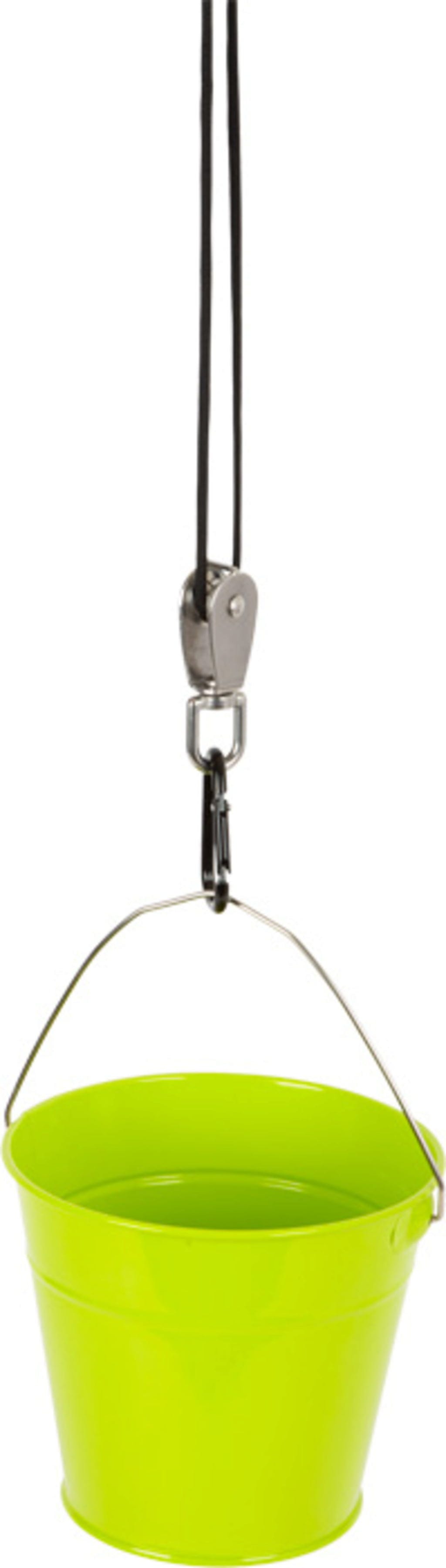 Che si tratti di case sugli alberi, casette o strutture da arrampicata, questo ingegnoso sistema di carrucole consente di trasportare carichi quasi senza sforzo. I bimbi non solo ottengono un aiuto pratico per le loro avventure, ma imparano anche come funzionano le forze in modo giocoso. Per evitare che il carico prezioso si ribalti, una piccola tacca sul manico del secchio mantiene il moschettone in posizione.