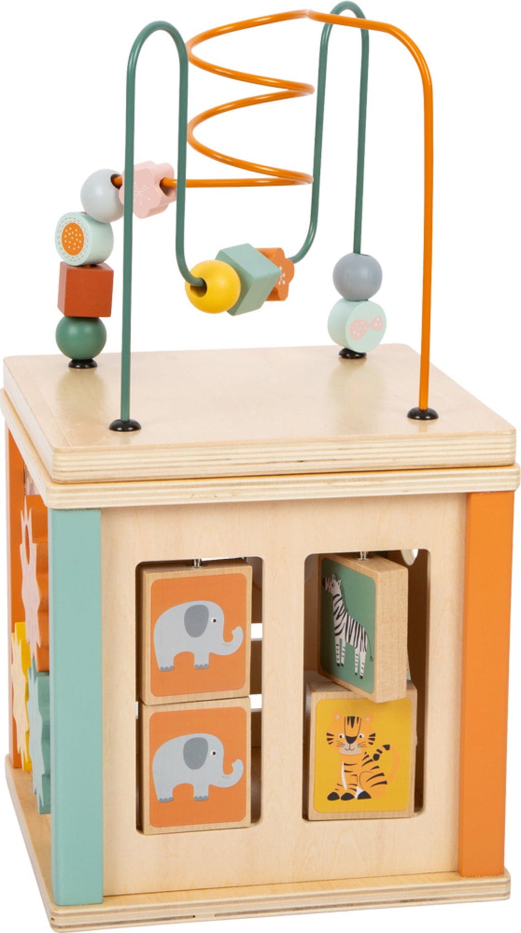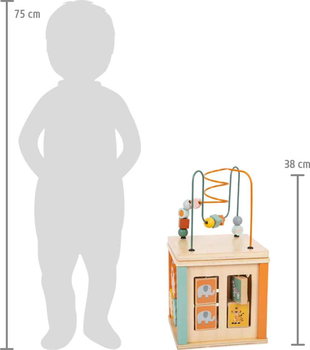 Il cubo "Safari" è il giocattolo perfetto per esercitare in modo giocoso la motricità fine e il riconoscimento di colori e forme. Su cinque lati, due labirinti di perline, un gioco di abbinamento di forme, un labirinto scorrevole, alette rotanti e un gioco di ingranaggi invitano i piccoli esploratori a vivere emozionanti avventure. I simpatici animali del safari accompagnano il bambino e rendono il cubo un vero e proprio elemento di spicco in ogni cameretta, grazie alla robusta struttura in legno e plastica. Un gioco versatile che stimola la creatività e la concentrazione!